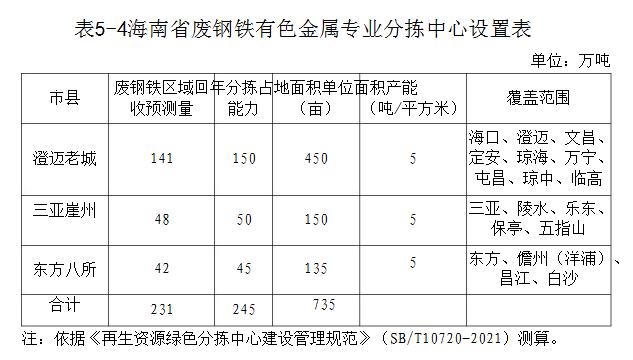 澄邁老城廢鋼鐵專業(yè)型分揀中心。依托金馬物流綜合產(chǎn)業(yè)園,承擔(dān)全省北部、東部地區(qū)廢鋼鐵、廢電池(鉛酸電池除外)等再生資源回收分揀服務(wù)。配套建設(shè)倉(cāng)儲(chǔ)配送區(qū)、加工分揀區(qū)、配套服務(wù)區(qū)。用地約450畝,年分揀能力150萬噸。