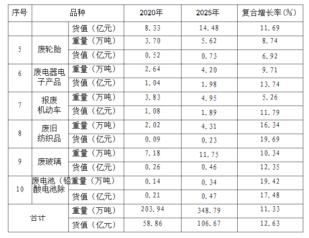 2.到2025年,實(shí)現(xiàn)廢鋼鐵、廢有色金屬、廢塑料、廢紙、廢輪胎、廢電器電子產(chǎn)品、報(bào)廢機(jī)動(dòng)車、廢電池等再生資源主要品種回收率達(dá)85%以上,95%以上鄉(xiāng)鎮(zhèn)、社區(qū)、行政村建立再生資源回收網(wǎng)點(diǎn),90%以上回收人員納入規(guī)范化管理。