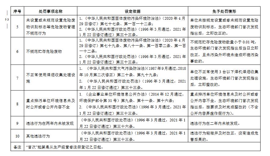 《河南省生態(tài)環(huán)境行政處罰裁量基準(zhǔn)適用規(guī)則》(豫環(huán)文〔2020〕177號(hào))明確了8項(xiàng)全省生態(tài)環(huán)境違法行為免予處罰事項(xiàng)。行政處罰法修訂后,依據(jù)《中華人民共和國(guó)行政處罰法》和《河南省優(yōu)化營(yíng)商環(huán)境條例》的規(guī)定,《河南省生態(tài)環(huán)境廳辦公室關(guān)于優(yōu)化生態(tài)環(huán)境綜合執(zhí)法助力企業(yè)綠色發(fā)展的通知》(豫環(huán)辦〔2021〕59號(hào))對(duì)免予處罰事項(xiàng)進(jìn)行了調(diào)整,公布了10項(xiàng)全省生態(tài)環(huán)境違法行為免予處罰事項(xiàng)(以下簡(jiǎn)稱“免予處罰事項(xiàng)”,見附件1)。各級(jí)生態(tài)環(huán)境部門應(yīng)當(dāng)嚴(yán)格按照免予處罰事項(xiàng)條件,結(jié)合違法行為的事實(shí)、證據(jù)進(jìn)行綜合判斷后認(rèn)定,對(duì)確實(shí)符合免予處罰事項(xiàng)條件的,依法免予處罰。