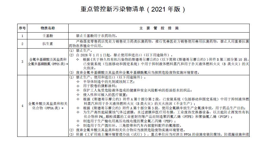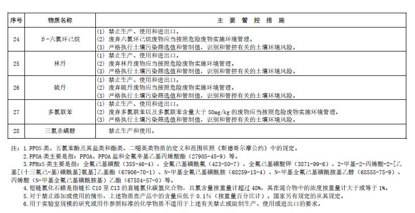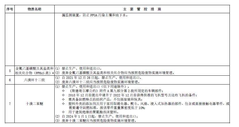 自2021 年12 月26 日起,禁止六溴環(huán)十二烷的生產(chǎn)、加工使用和進(jìn)出口;到2022 年底,禁止銷售含塑料微珠的日化產(chǎn)品。2025 年底前,逐步禁止PFHxS 類、十溴二苯醚、短鏈氯化石蠟、五氯苯酚及其鹽類和酯類、六氯丁二烯、得克隆的生產(chǎn)、加工使用和進(jìn)出口;嚴(yán)格限制PFOS 類、PFOA 類的生產(chǎn)和加工使用;禁止壬基酚用于農(nóng)藥助劑;基本實現(xiàn)二噁英類全面達(dá)標(biāo)排放。