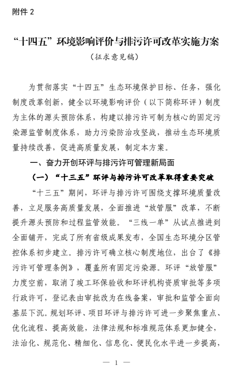 《“十四五”環(huán)境影響評價(jià)與排污許可改革實(shí)施方案》(征求意見稿)