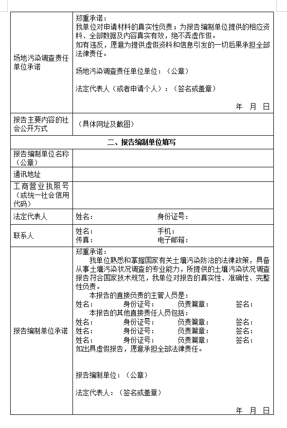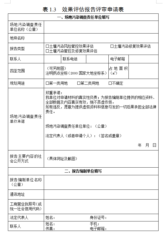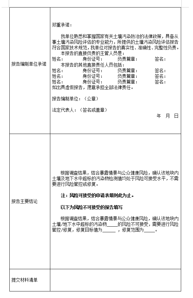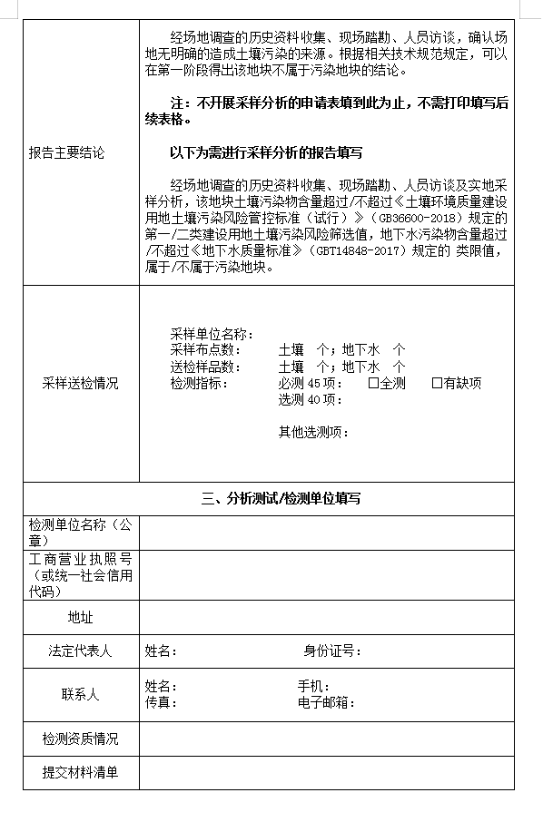對于第一階段通過現(xiàn)場踏勘、資料查詢和人員訪談等調研可以直接得出“無可能的污染源”結論的地塊,調查報告的申請表中填完第一階段調查結論即止;對于需要開展采樣檢測的地塊,申請表中其它相關信息需填寫完整。《天津市建設用地土壤污染狀況調查、風險評估、風險管控及修復效果評估報告評審細則(試行)》