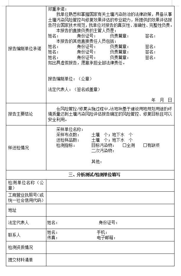 (二)報告編制單位(或檢測單位)應當具備專業(yè)能力,并將工作場所、資質能力、技術人員、專業(yè)設備、業(yè)績等相關信息在市評審系統(tǒng)登記,應依法對其出具的調查報告、風險評估報告、效果評估報告、檢測報告的真實性、準確性、完整性負責,并按照約定對風險管控、修復、后期管理等活動結果負責。報告編制單位在市評審系統(tǒng)登記虛假信息、編造虛假記錄、圖片、檢驗檢測數據,承擔相應法律責任。模版下載_工作報告_報告模板