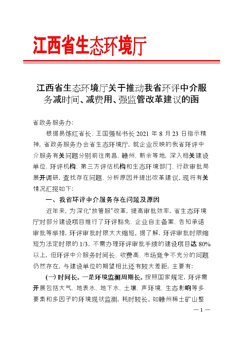 《江西關(guān)于省政府公文處理單<關(guān)于推動江西省環(huán)評中介服務(wù)減時間、減費(fèi)用、強(qiáng)監(jiān)管的改革建議>的反饋意見》
