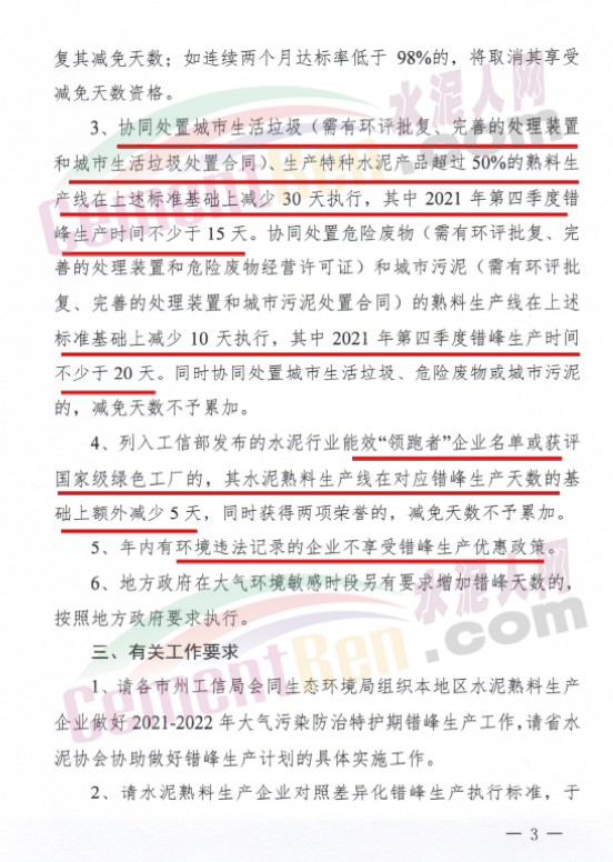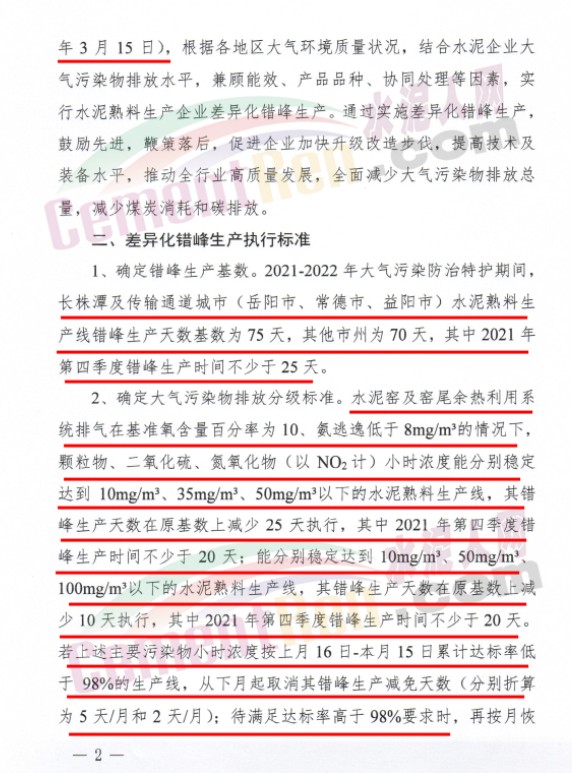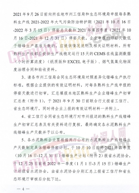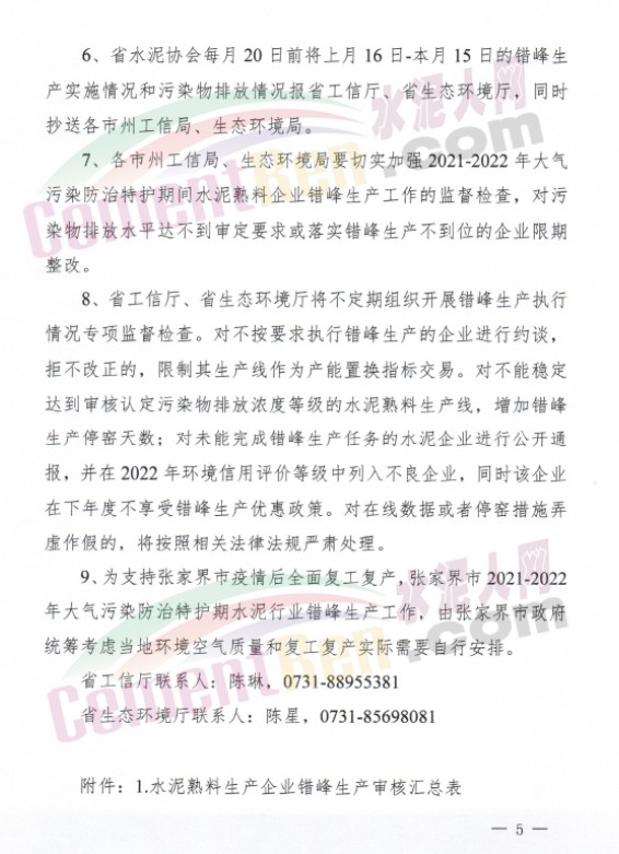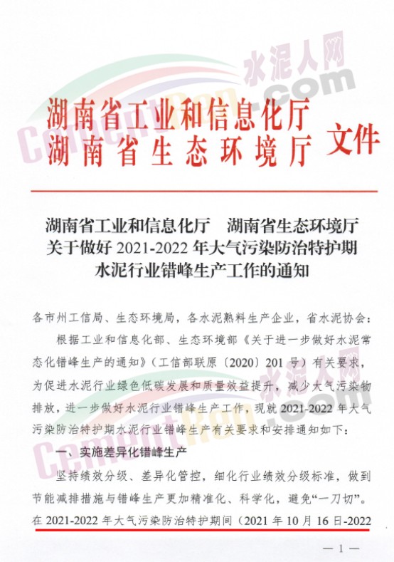 湖南省工業(yè)和信息化廳聯(lián)合湖南省生態(tài)環(huán)境廳發(fā)布《關(guān)于做好 2021-2022年大氣污染防治特護期水泥行業(yè)錯峰生產(chǎn)工作的通知》給旗下各市州工信局、生態(tài)環(huán)境局,各水泥熟料生產(chǎn)企業(yè),省水泥協(xié)會稱:根據(jù)工業(yè)和信息化部、生態(tài)環(huán)境部相關(guān)文件要求, 為促進水泥行業(yè)綠色低碳發(fā)展和質(zhì)量效益提升,減少大氣污染物排放,進一步做好水泥行業(yè)錯峰生產(chǎn)工作,就2021-2022年大氣 污染防治特護期水泥行業(yè)錯峰生產(chǎn)作出有關(guān)要求和安排。