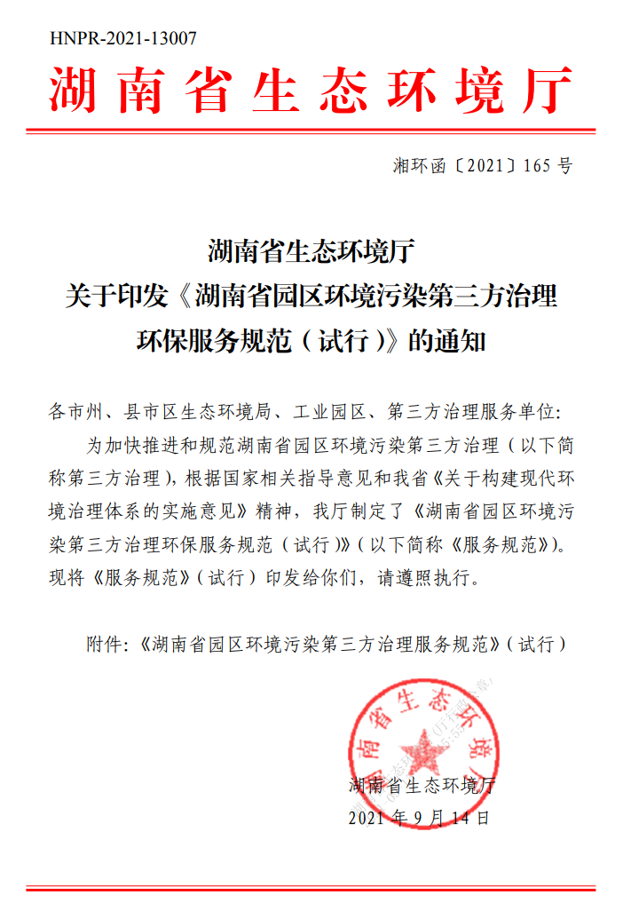 湖南省生態(tài)環(huán)境廳關(guān)于印發(fā)《湖南省園區(qū)環(huán)境污染第三方治理環(huán)保服務(wù)規(guī)范(試行)》的通知