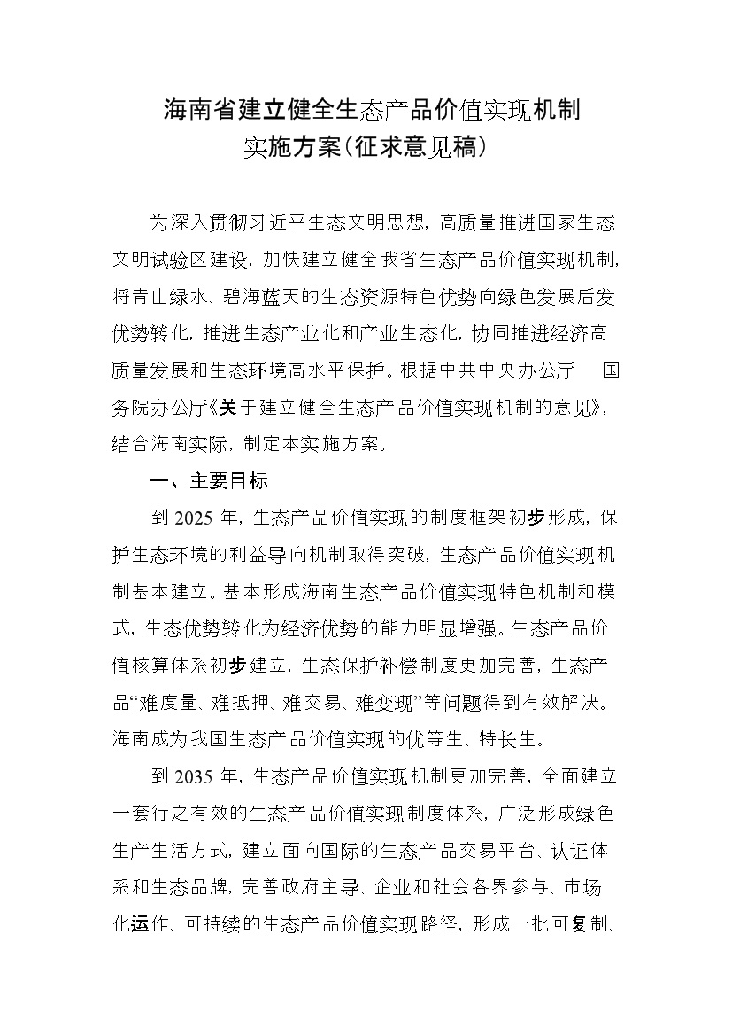 附件:《海南省建立健全生態(tài)產(chǎn)品價值實現(xiàn)機制實施方案(征求意見稿)》