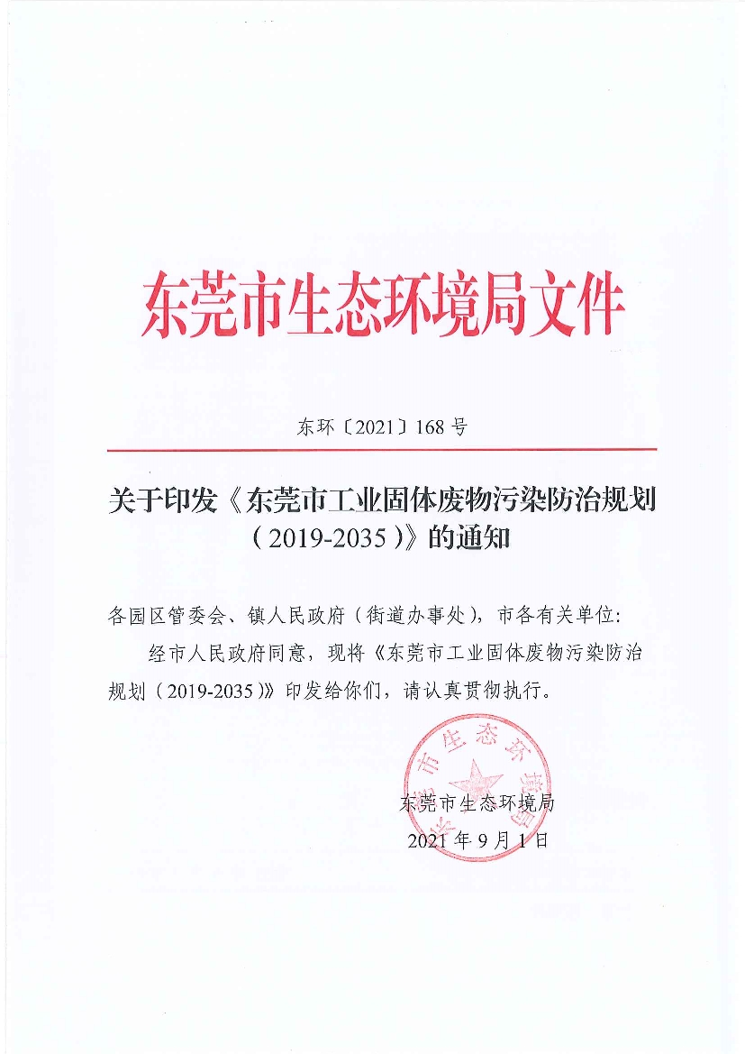 《東莞市工業(yè)固體廢物污染防治規(guī)劃(2019-2035)》(東環(huán)【2021】168號(hào))