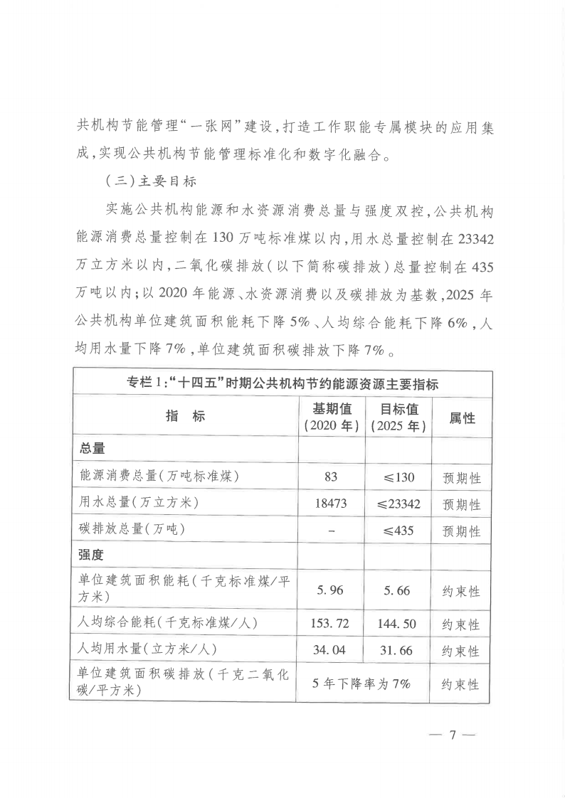 《規(guī)劃》要求,“十四五”期間,全省各級(jí)公共機(jī)構(gòu)以數(shù)字化改革為牽引,以共同富裕示范區(qū)建設(shè)為契機(jī),扎實(shí)推進(jìn)公共機(jī)構(gòu)節(jié)約能源資源工作高質(zhì)量發(fā)展,廣泛形成綠色低碳生產(chǎn)生活方式,充分發(fā)揮公共機(jī)構(gòu)的示范引領(lǐng)作用。要實(shí)施公共機(jī)構(gòu)能源和水資源消費(fèi)總量與強(qiáng)度雙控,以2020年能源、水資源消費(fèi)以及碳排放為基數(shù),2025年公共機(jī)構(gòu)單位建筑面積能耗下降5%、人均綜合能耗下降6%,人均用水量下降7%,單位建筑面積碳排放下降7%。