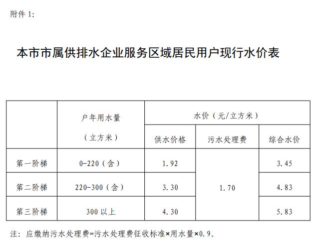 目前,本市居民第一階梯綜合水價(jià)為每立方米 3.45 元,其中供水價(jià)格為每立方米 1.92 元,應(yīng)繳納污水處理費(fèi)為每立方米 1.53 元(現(xiàn)行居民水價(jià)表詳見(jiàn)附件 1)。