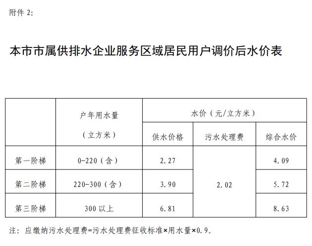 第一階梯綜合水價(jià)從現(xiàn)行的每立方米 3.45 元調(diào)整為4.09 元,其中供水價(jià)格為每立方米 2.27 元,應(yīng)繳納污水處理費(fèi)為每立方米 1.82 元;第二階梯綜合水價(jià)從現(xiàn)行的每立方米 4.83 元調(diào)整為 5.72 元,其中供水價(jià)格為每立方米 3.90元;第三階梯綜合水價(jià)從現(xiàn)行的每立方米5.83元調(diào)整為8.63元,其中供水價(jià)格為每立方米 6.81 元。居民用戶水價(jià)調(diào)整幅度平均為 19%,調(diào)價(jià)后水價(jià)表見(jiàn)附件 2。