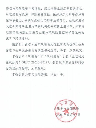 《太原市農(nóng)用地轉(zhuǎn)為建設(shè)用地土壤污染狀況調(diào)查工作技術(shù)指引(試行)》(并環(huán)函【2021】111號(hào))