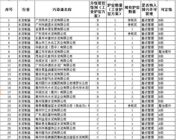 廣東省水泥制造行業(yè)工業(yè)爐窯分級管控表