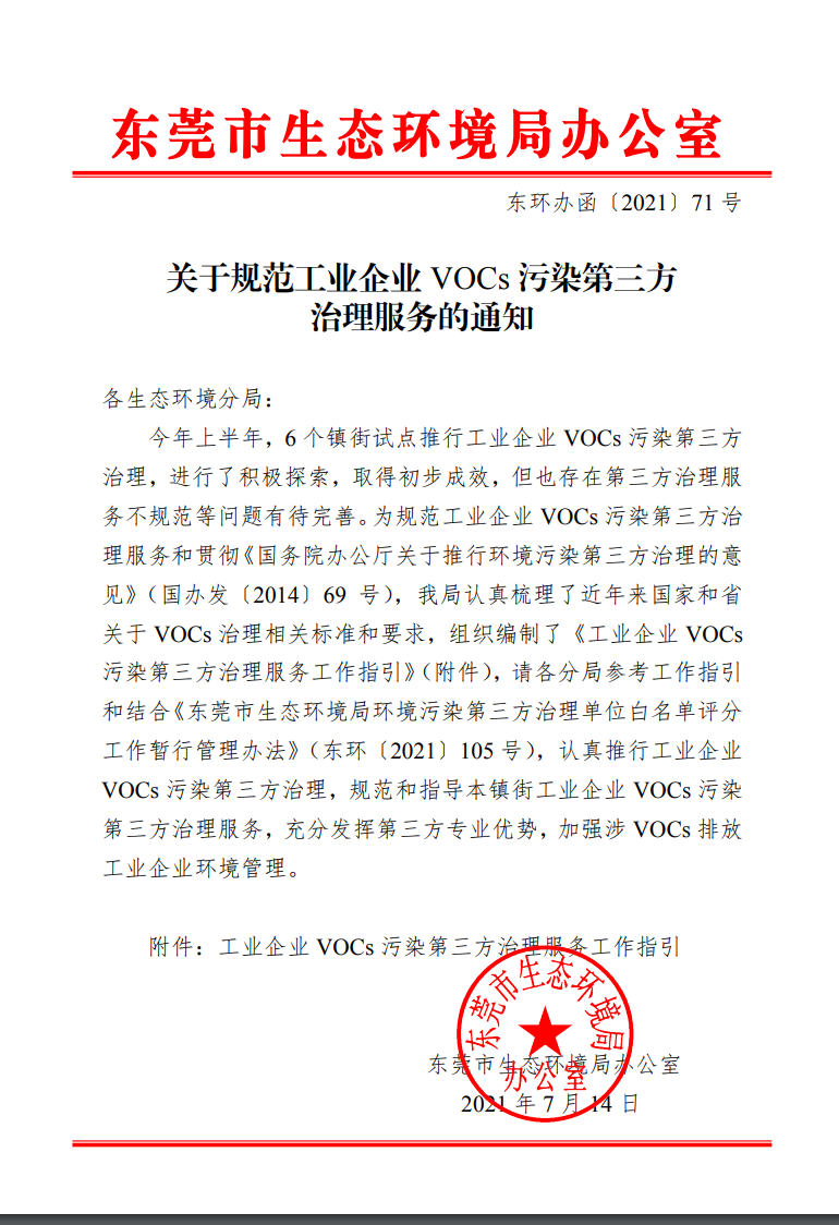《東莞關于規(guī)范工業(yè)企業(yè)VOCs污染第三方治理服務的通知》(東環(huán)辦函【2021】71號)