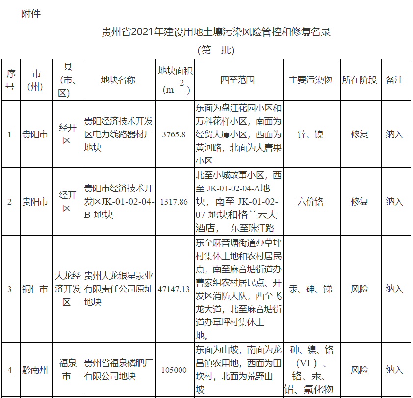 《貴州省2021年建設(shè)用地土壤污染風(fēng)險管控和修復(fù)名錄 (第一批)》