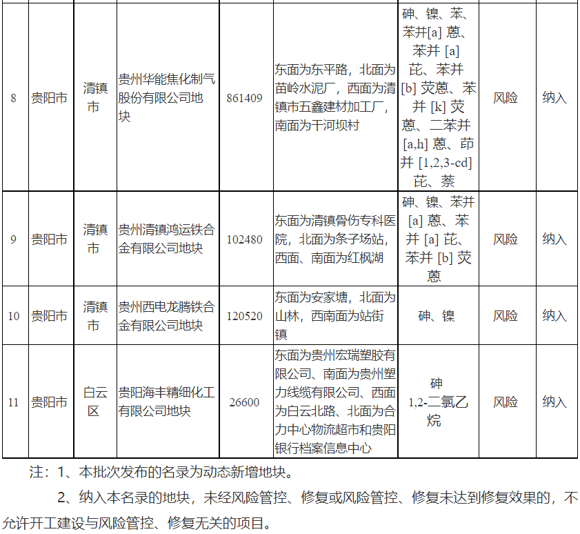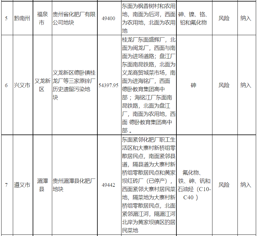 根據(jù)評審結(jié)論,決定將貴陽經(jīng)濟技術(shù)開發(fā)區(qū)電力線路器材廠地塊(占地面積3765.8m2)、貴陽市經(jīng)濟技術(shù)開發(fā)區(qū)JK-01-02-04-B地塊(占地面積1317.86m2)、貴州省福泉磷肥廠有限公司地塊(占地面積105000m2)、貴州省化肥廠有限公司地塊(占地面積49400m2)、義龍新區(qū)德臥鎮(zhèn)桂龍廠等三家原鋅廠歷史遺留污染地塊(占地面積54397.95m2)、貴州湄潭縣化肥廠地塊(占地面積49442m2)、貴州華能焦化制氣股份有限公司地塊(占地面積861409m2)、貴州清鎮(zhèn)鴻運鐵合金有限公司地塊(占地面積102480m2)、貴州西電龍騰鐵合金有限公司地塊(占地面積120520m2)、貴陽海豐精細化工有限公司地塊(占地面積26600m2)、貴州大龍銀星汞業(yè)有限責(zé)任公司原址地塊(占地面積47147.13m2)11個地塊新增納入《2021年貴州省建設(shè)用地土壤污染風(fēng)險管控和修復(fù)名錄》(以下簡稱名錄)管理。