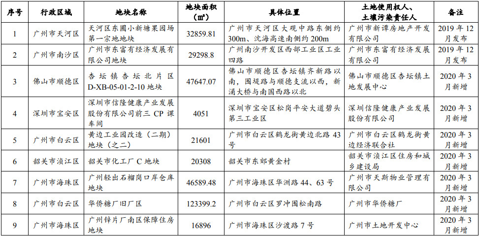 根據(jù)建設(shè)用地土壤污染風(fēng)險評估情況,將廣州市番禺區(qū)大龍街漢基大道13號地塊、番禺珠江鋼管廠原址1~3號地塊、番禺珠江鋼管廠原址4、5號地塊、番禺珠江鋼管廠原址6、8號地塊、番禺珠江鋼管廠原址7號地塊、廣州市荔灣區(qū)康王北路小梅大街7號地塊、白云區(qū)黃金圍貨運站地塊、廣州市番禺區(qū)邦騰化工有限責(zé)任公司地塊、廣東省粵北無機鹽廠、中山市東區(qū)起灣北道142號之五地塊、郁南縣南興再生資源回收有限公司平臺第二分公司原生產(chǎn)經(jīng)營地塊、中山市東區(qū)起灣北道142號之六、七地塊、平臺鎮(zhèn)登高電池廠和電鍍車間地塊共13個地塊納入名錄。