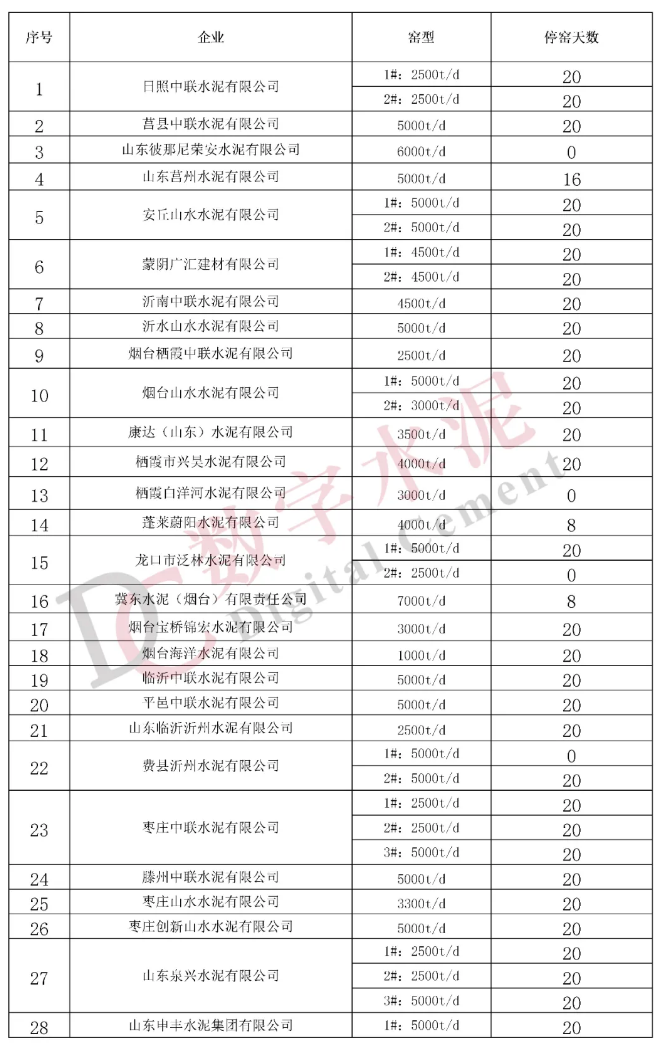 期間未按計(jì)劃執(zhí)行錯(cuò)峰生產(chǎn)的企業(yè)有:山東彼那尼榮安水泥有限公司、山東莒州水泥有限公司、濟(jì)寧海螺水泥有限公司、山東魯珠建材有限公司、棲霞白洋河水泥有限公司、冀東水泥(煙臺(tái))有限責(zé)任公司、龍口市泛林水泥有限公司、費(fèi)縣沂州水泥有限公司、泉頭集團(tuán)棗莊金橋旋窯水泥有限公司、滕州市東郭水泥有限公司、濰坊魯元建材有限公司、山東山鋁環(huán)境新材料有限公司、淄博魯中水泥有限公司、山東東華水泥有限公司、淄博崇正特種水泥有限責(zé)任公司、淄博綠源建材有限責(zé)任公司、淄博中昌特種水泥有限公司、山東華銀特種水泥股份有限公司、山東臨朐勝濰特種水泥有限公司。