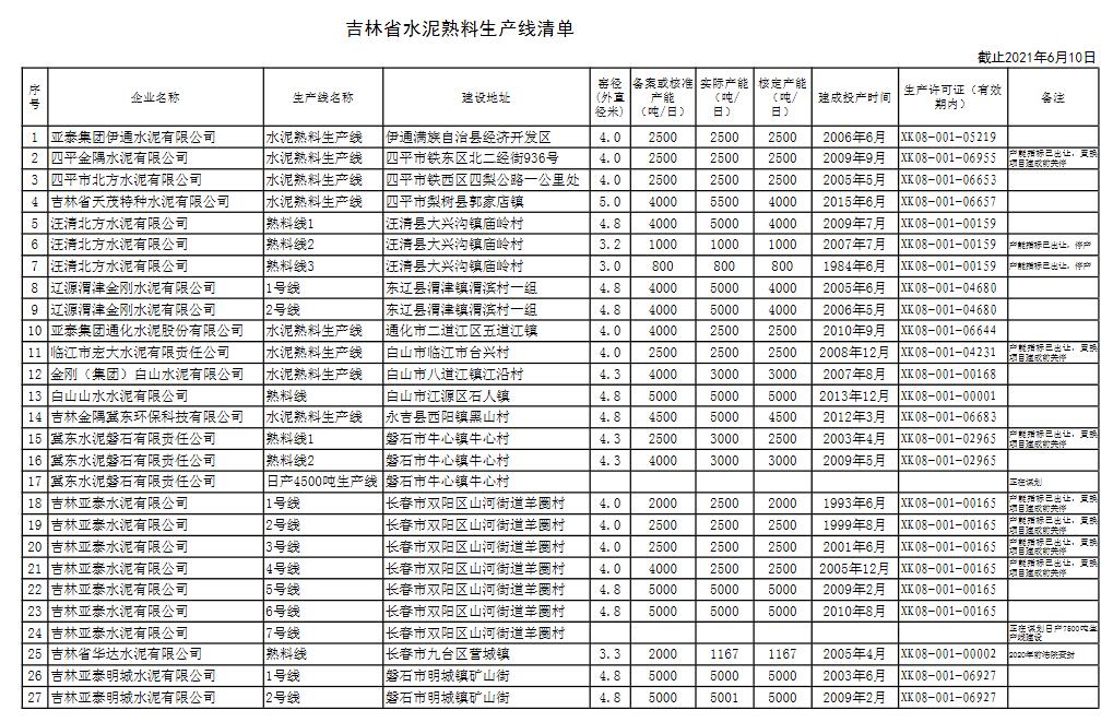 《吉林省水泥熟料、平板玻璃生產(chǎn)線清單》