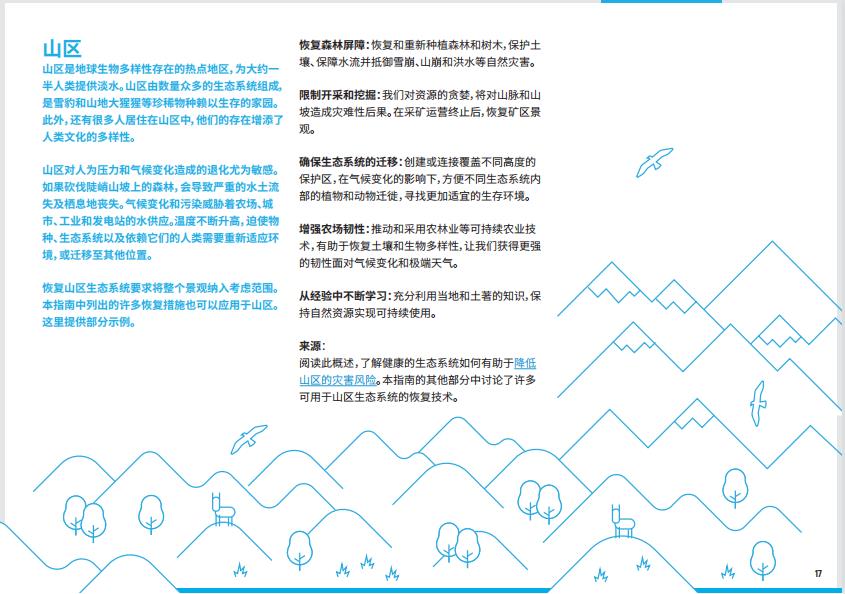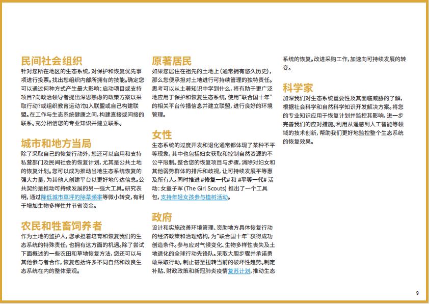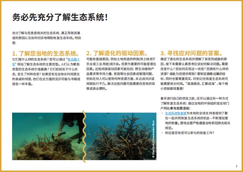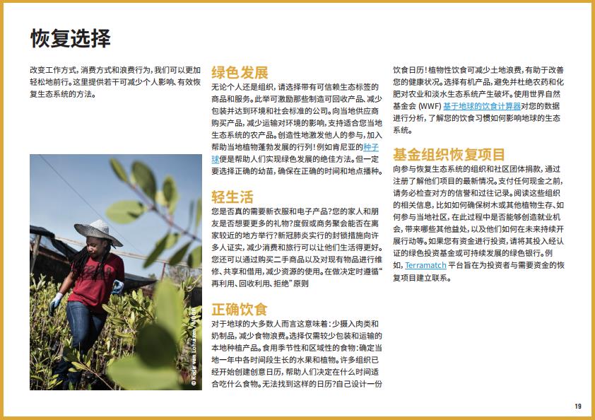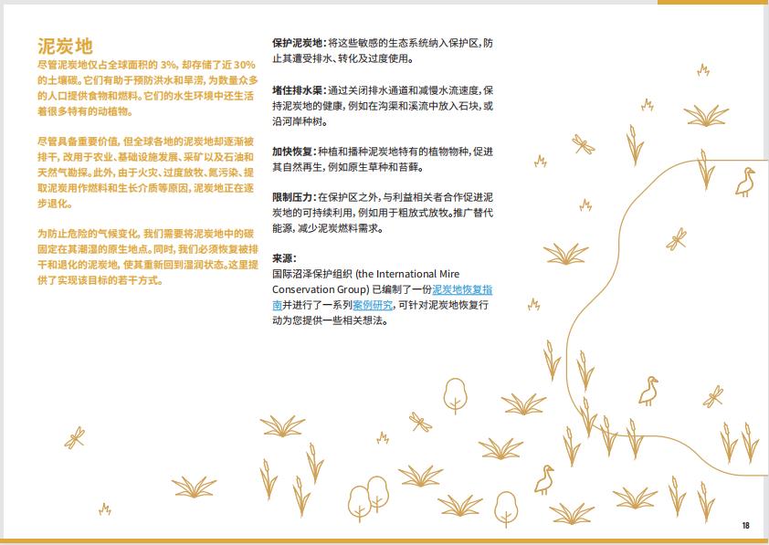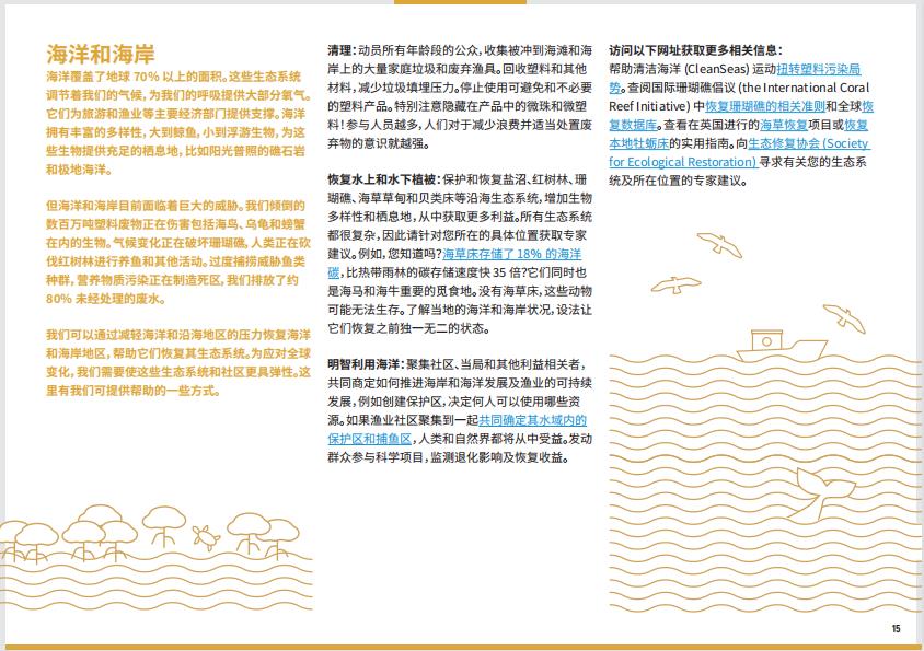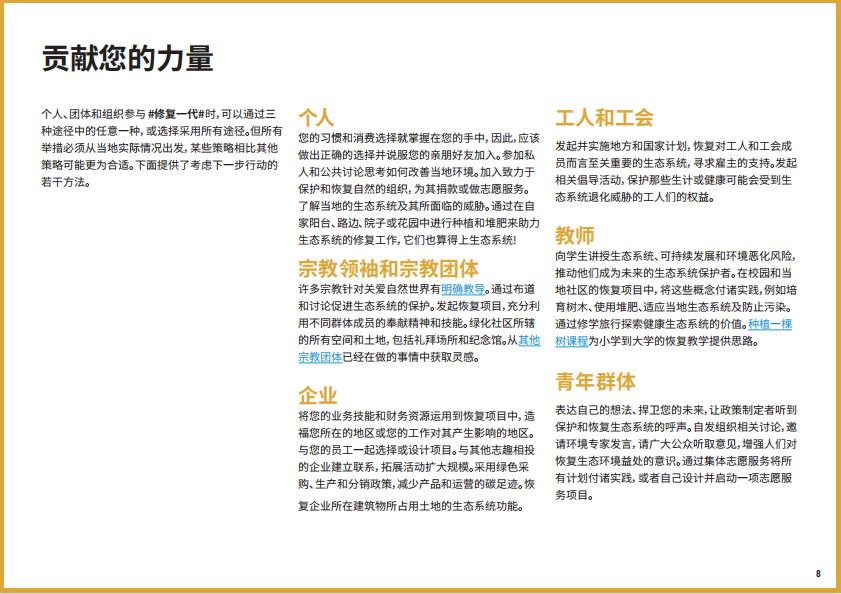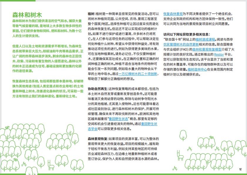 這份長(zhǎng)達(dá)21頁(yè)的指南介紹了恢復(fù)八種主要生態(tài)系統(tǒng)類型的方法——森林、農(nóng)田、草原和熱帶稀樹草原、河流和湖泊、海洋和海岸、城鎮(zhèn)和城市、泥炭地和山脈。它還列舉了社會(huì)各界——從個(gè)人和社區(qū)團(tuán)體到企業(yè)和政府——如何貢獻(xiàn)力量。詳情如下: