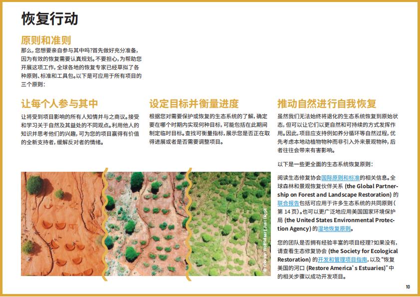 《生態(tài)系統(tǒng)修復(fù)手冊(cè)》介紹了有助于減緩和阻止生態(tài)系統(tǒng)退化并促進(jìn)其恢復(fù)的一系列行動(dòng),概述了在即將步入的“聯(lián)合國(guó)十年”及未來(lái)更漫長(zhǎng)的歲月中參與生態(tài)系統(tǒng)修復(fù)的三大途徑: