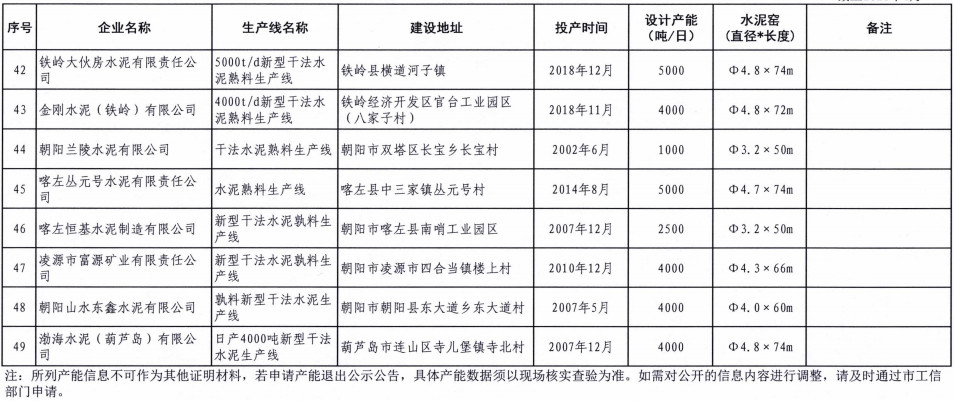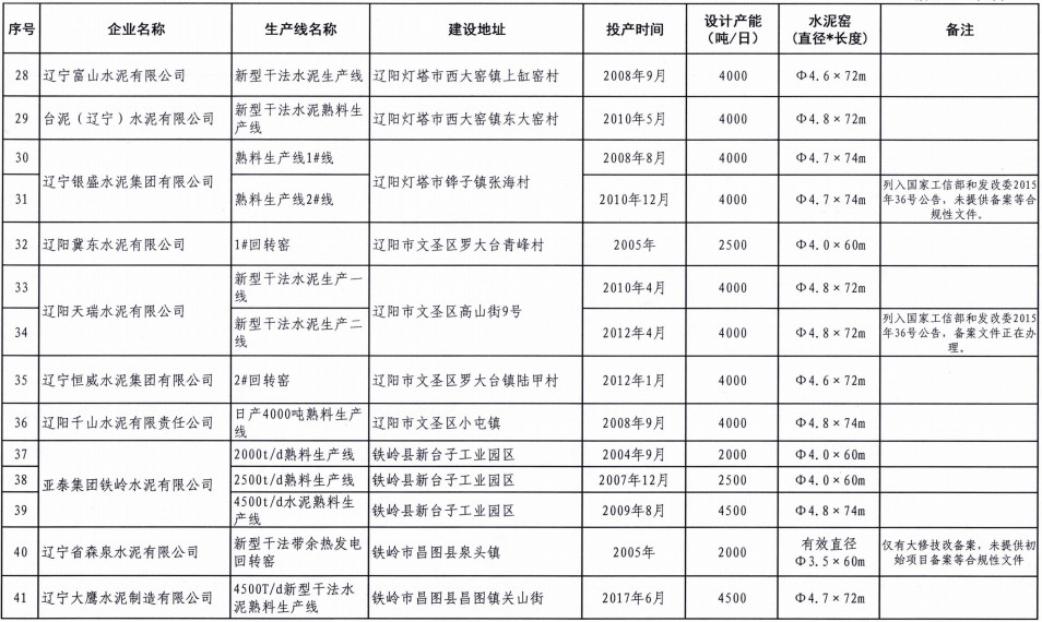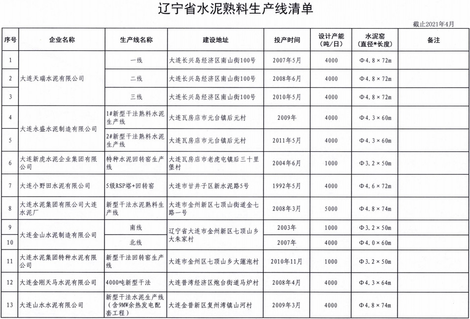《遼寧省水泥熟料及平板玻璃生產(chǎn)線清單》