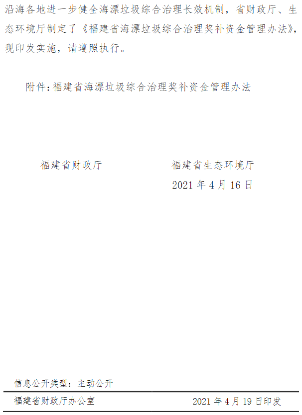 《福建省海漂垃圾綜合治理獎補(bǔ)資金管理辦法》(閩財(cái)資環(huán)【2021】9號)