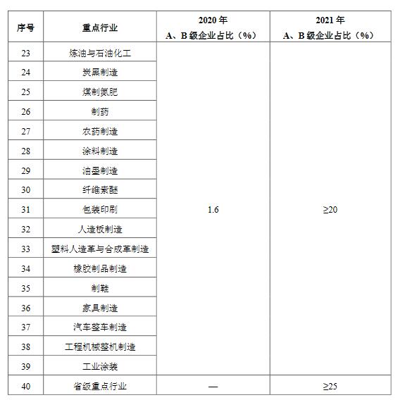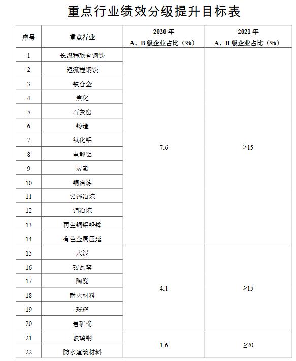 —鋼鐵、鐵合金、焦化、石灰窯、鑄造、氧化鋁、電解鋁、炭素、銅冶煉、鉛鋅冶煉、鉬冶煉、再生銅鋁鉛鋅、有色金屬壓延等金屬類行業(yè)A、B級企業(yè)占比從7.6%提升到15%以上;水泥、磚瓦窯、陶瓷、耐火材料、玻璃、巖礦棉等建材類行業(yè)A、B級企業(yè)占比從4.1%提升到15%以上;玻璃鋼、防水建筑材料、煉油與石油化工、炭黑制造、煤制氮肥、制藥、農(nóng)藥制造、涂料制造、油墨制造、纖維素醚、包裝印刷、人造板制造、塑料人造革與合成革制造、橡膠制品制造、制鞋、家具制造、汽車整車制造、工程機械整機制造、工業(yè)涂裝等涉VOCs類行業(yè)A、B級企業(yè)占比從1.6%提升到20%以上。省級制定的重點行業(yè)績效分級A、B級企業(yè)占比不低于25%。(見附件1)大牛工程師