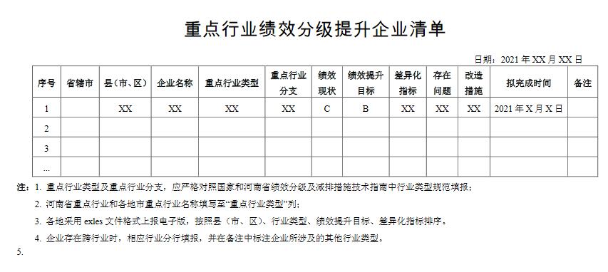 (四)信息公開階段(2021年11月1日至11月15日)各地及時將企業(yè)績效評級結果向社會公告,自覺接受同行業(yè)和全社會的監(jiān)督,并依據(jù)評定結果修訂完善重污染天氣應急減排清單,落實差異化管控措施。重污染天氣應急減排清單按規(guī)定程序和時限要求報生態(tài)環(huán)境部備案審查。《河南省2021年重點行業(yè)績效分級提升行動方案》