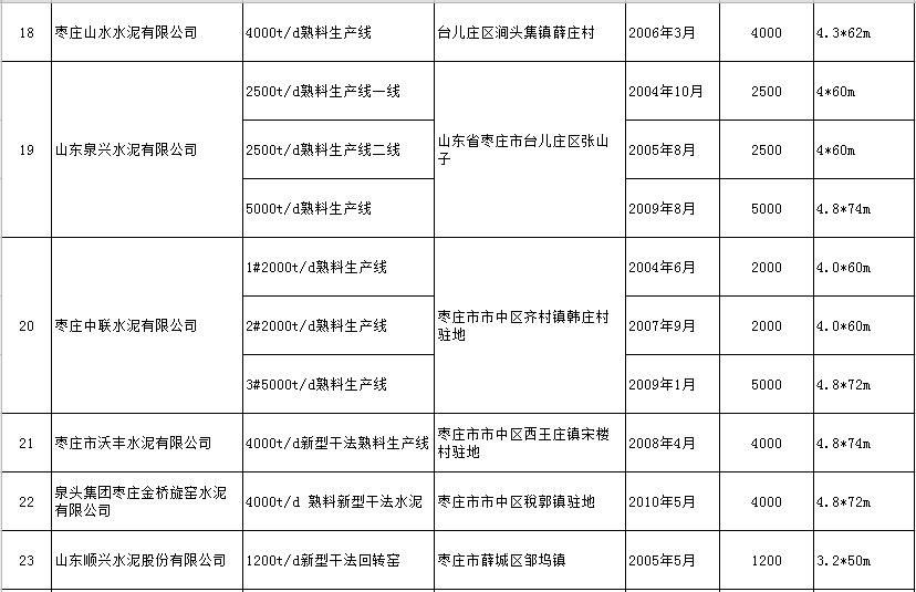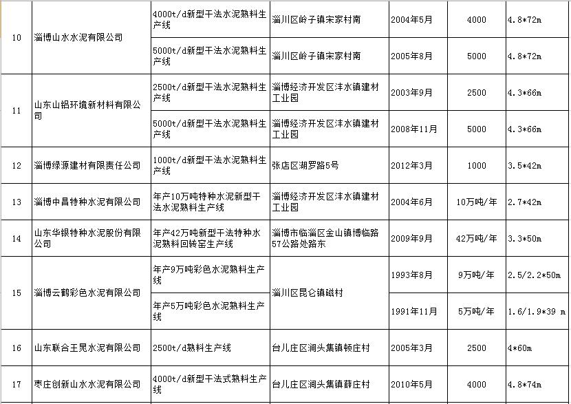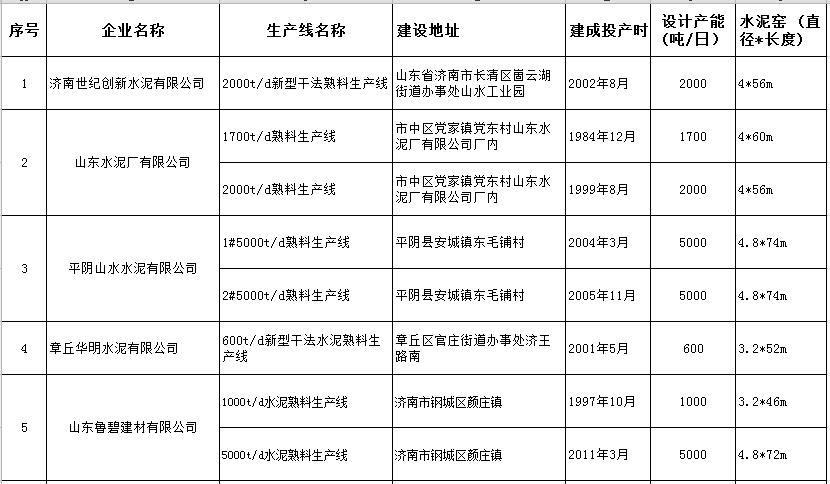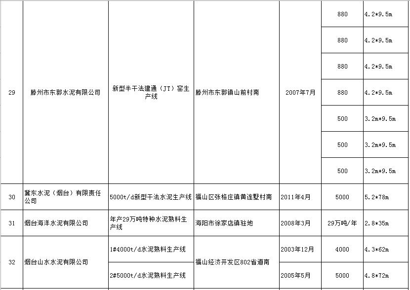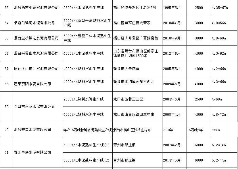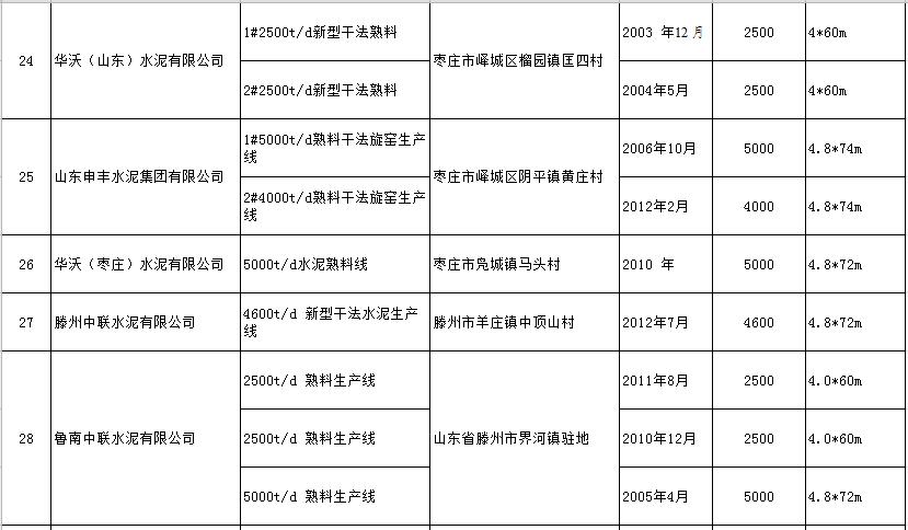 山東省水泥熟料生產(chǎn)線清單