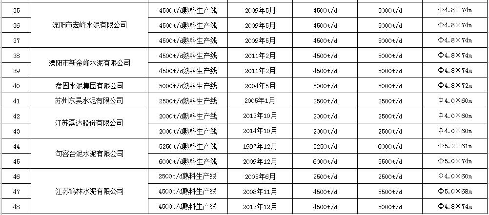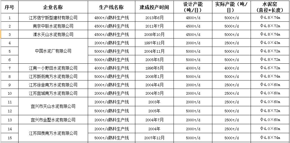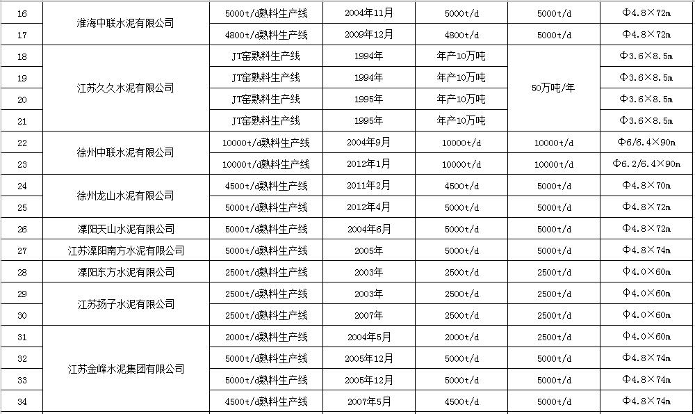 江蘇省水泥熟料生產(chǎn)線清單