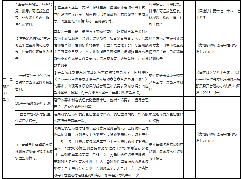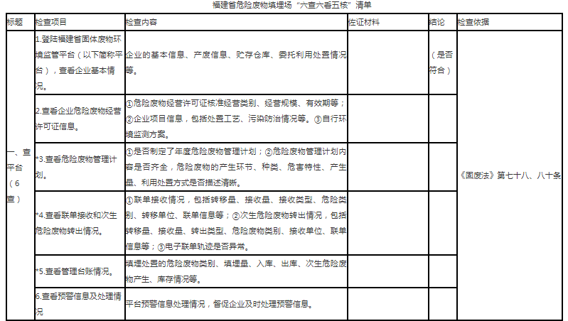 生態(tài)環(huán)境主管部門應(yīng)重點(diǎn)根據(jù)“六查六看五核”的要求,對危險廢物填埋場開展日常抽查,抽查項(xiàng)目共17項(xiàng)。