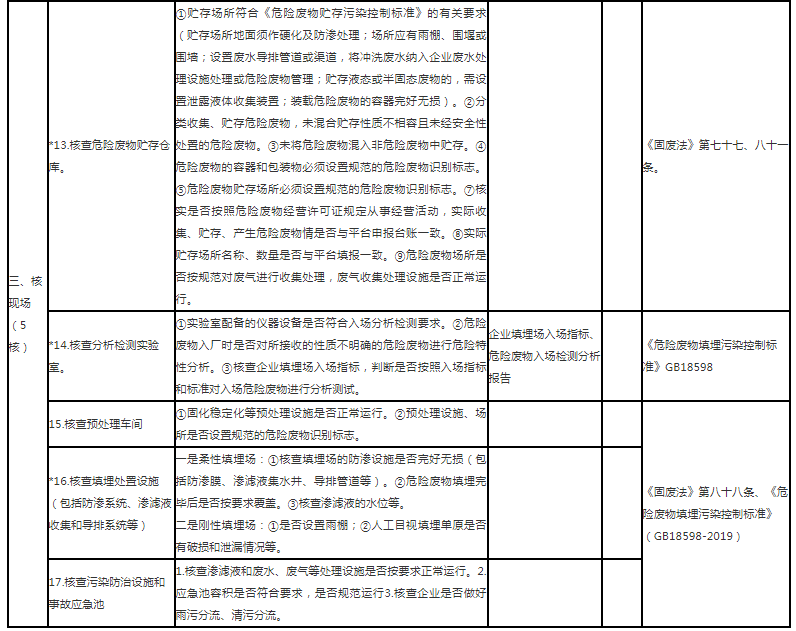 三是五核。現(xiàn)場核查危險廢物貯存?zhèn)}庫、實(shí)驗(yàn)室、預(yù)處理車間、填埋處置設(shè)施、污染治理設(shè)施等。具體抽查要點(diǎn)詳見下表。