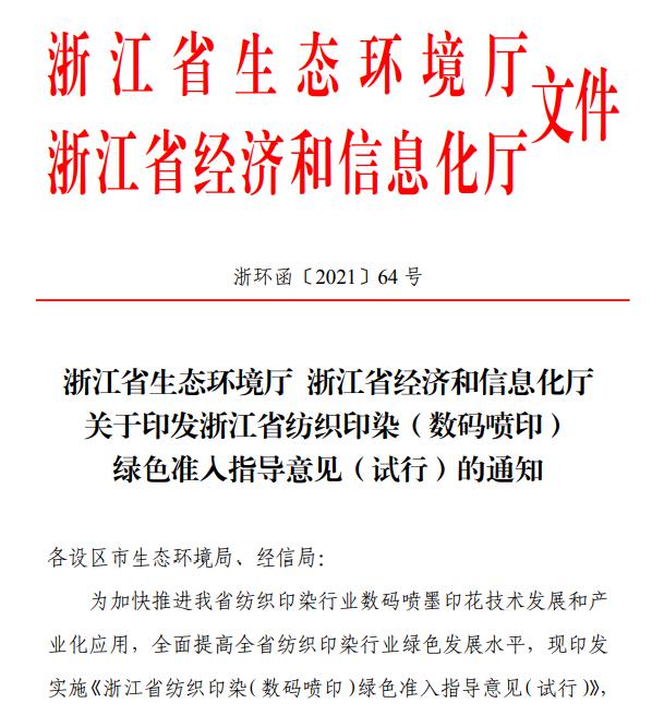 《浙江省紡織印染(數(shù)碼噴?。?綠色準(zhǔn)入指導(dǎo)意見(試行)》(浙環(huán)函【2021】64號(hào))
