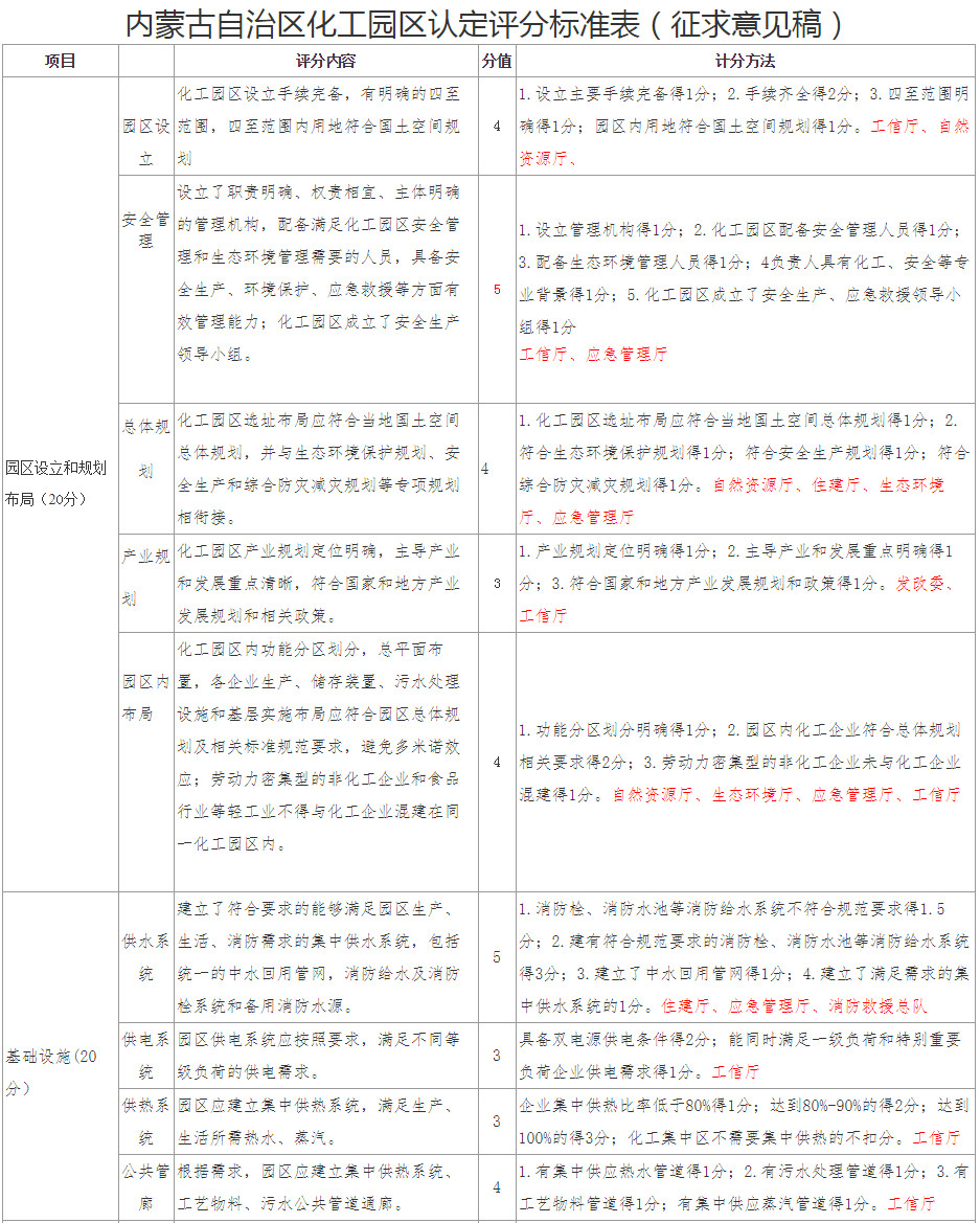 按照內(nèi)蒙古自治區(qū)安全生產(chǎn)委員會(huì)關(guān)于印發(fā)《內(nèi)蒙古自治區(qū)黨委辦公廳自治區(qū)人民政府辦公廳印發(fā)的通知》重點(diǎn)工作落實(shí)方案的通知(內(nèi)安委〔2021〕1號(hào))精神,自治區(qū)工信廳制定了《內(nèi)蒙古自治區(qū)化工園區(qū)(化工集中區(qū))認(rèn)定管理辦法(試行)(征求意見稿)》(簡稱《管理辦法》)《內(nèi)蒙古自治區(qū)化工園區(qū)認(rèn)定評(píng)分標(biāo)準(zhǔn)表》(簡稱《評(píng)分標(biāo)準(zhǔn)》),并征求了自治區(qū)應(yīng)急管理廳、發(fā)展改革委、自然資源廳、住房城鄉(xiāng)建設(shè)廳、交通運(yùn)輸廳、生態(tài)環(huán)境廳、公安廳、消防救援總隊(duì)意見建議,現(xiàn)將有關(guān)事項(xiàng)函告如下: