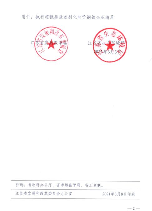 《江蘇:對未完成超低排放改造的鋼鐵企業(yè)執(zhí)行差別化電價(附鋼企清單)》(蘇發(fā)改價格發(fā)【2021】208號)