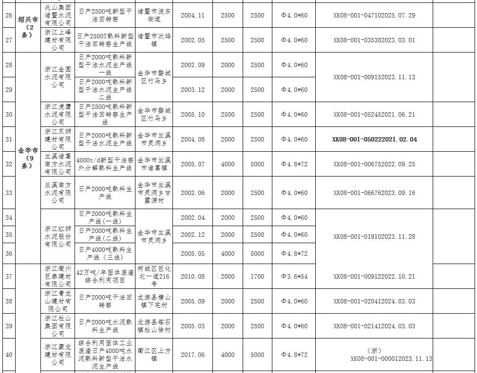 水泥熟料產(chǎn)能清單顯示,浙江省內(nèi)共有35家水泥企業(yè),48條水泥熟料生產(chǎn)線,批復建設產(chǎn)能合計4527萬噸/年,按窯徑計算產(chǎn)能合計5211萬噸/年。其中4條生產(chǎn)線450萬噸/年產(chǎn)能指標已明確出讓。