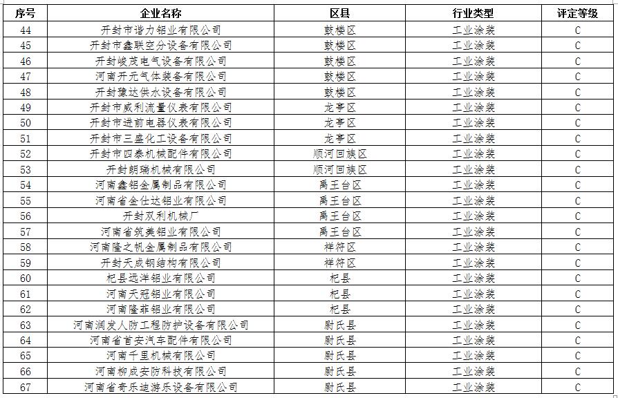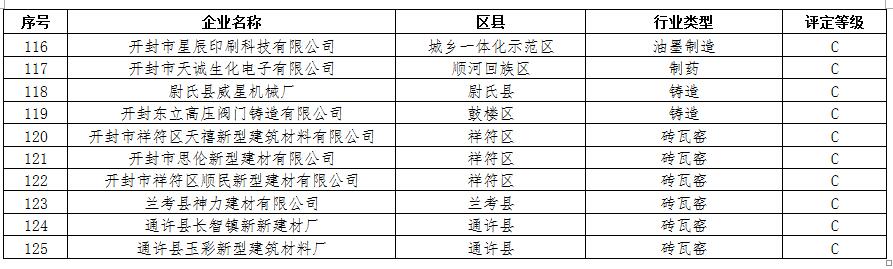日前,開封公示重污染天氣重點(diǎn)行業(yè)績效評級C級企業(yè),共125家。詳情如下: