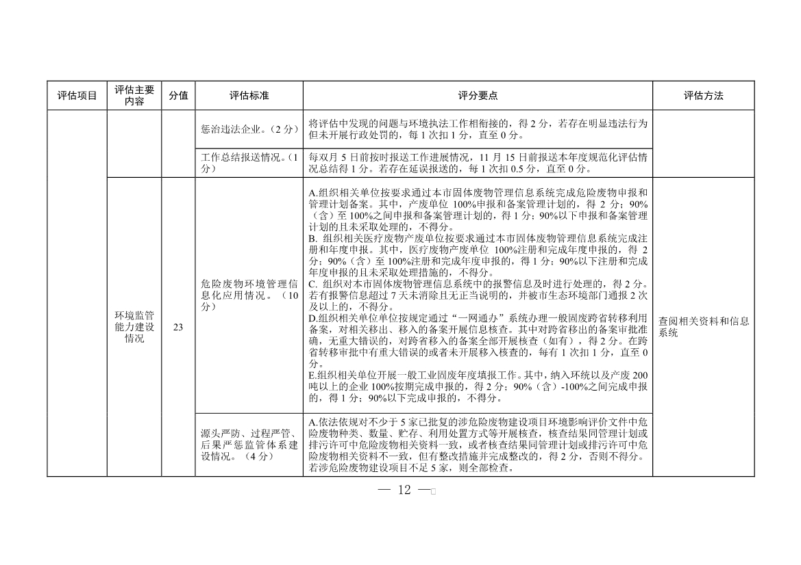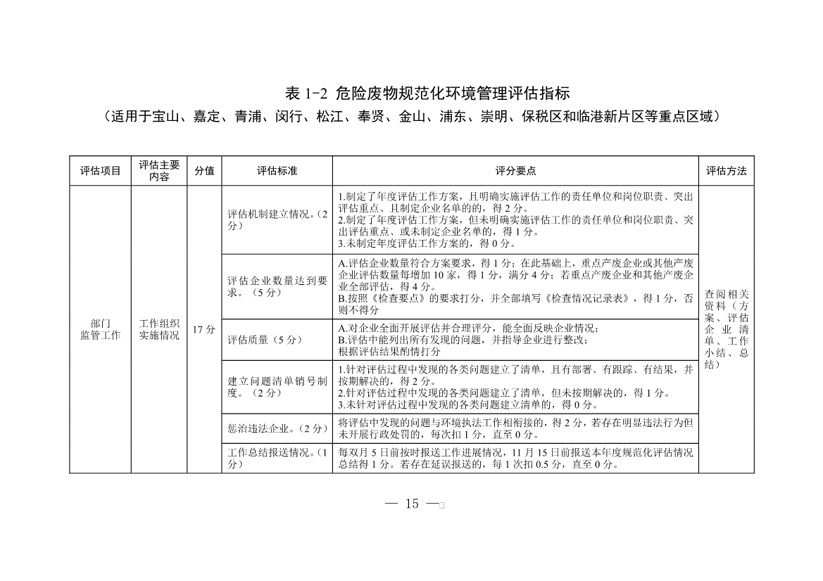 (三)評(píng)估安排。各區(qū)生態(tài)環(huán)境局于每雙月5日前將危險(xiǎn)廢物規(guī)范化環(huán)境管理評(píng)估工作階段性進(jìn)展報(bào)送市生態(tài)環(huán)境局,抄送市固化管理中心、市環(huán)境執(zhí)法總隊(duì)。于2022年11月15日前,按照《評(píng)估指標(biāo)》(附件1)進(jìn)行自評(píng)打分(其中,黃浦、靜安、徐匯、虹口、楊浦、長寧、普陀等非重點(diǎn)區(qū)域按照附表1-1進(jìn)行自評(píng)打分;寶山、嘉定、青浦、閔行、松江、奉賢、金山、浦東、崇明、保稅區(qū)和臨港新片區(qū)等重點(diǎn)區(qū)域按照附表1-2進(jìn)行自評(píng)打分),總結(jié)本年度規(guī)范化環(huán)境管理評(píng)估情況(附件4),并將上述兩項(xiàng)材料報(bào)送市生態(tài)環(huán)境局,抄送市固化管理中心、市環(huán)境執(zhí)法總隊(duì)。