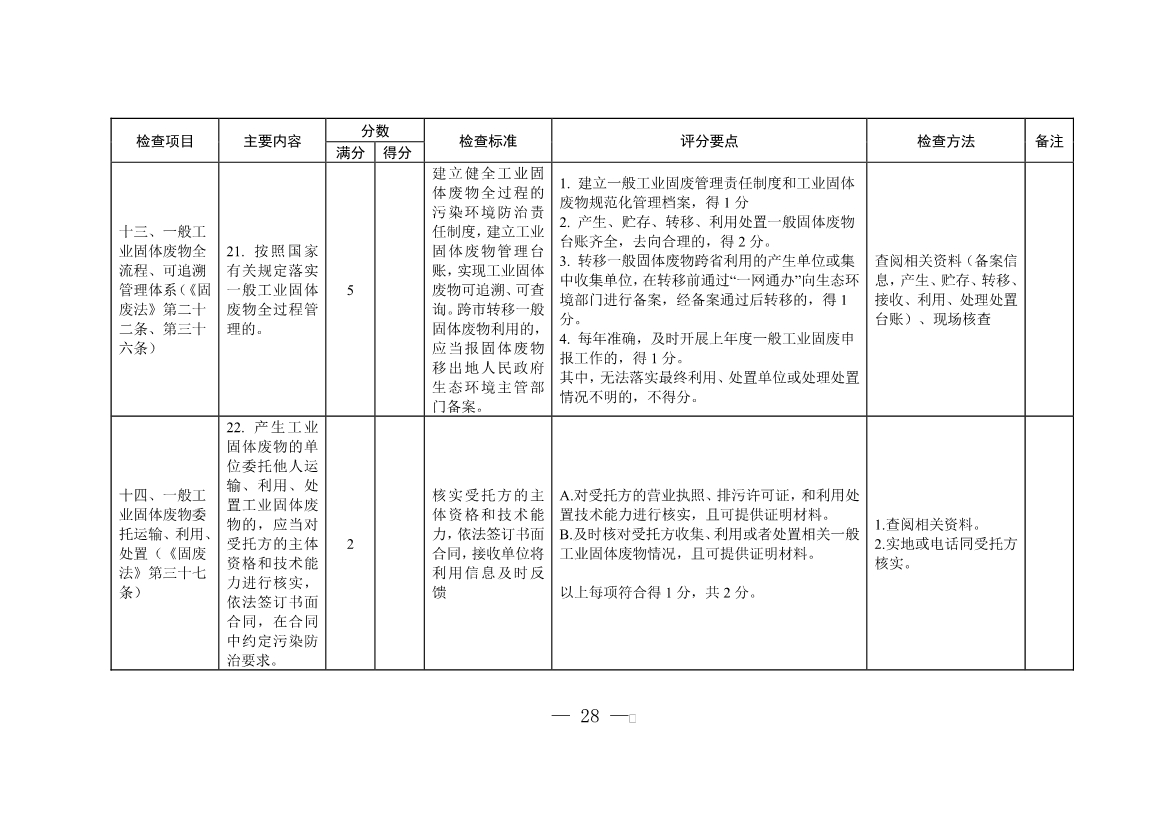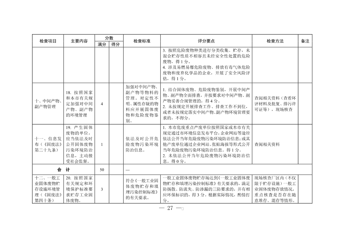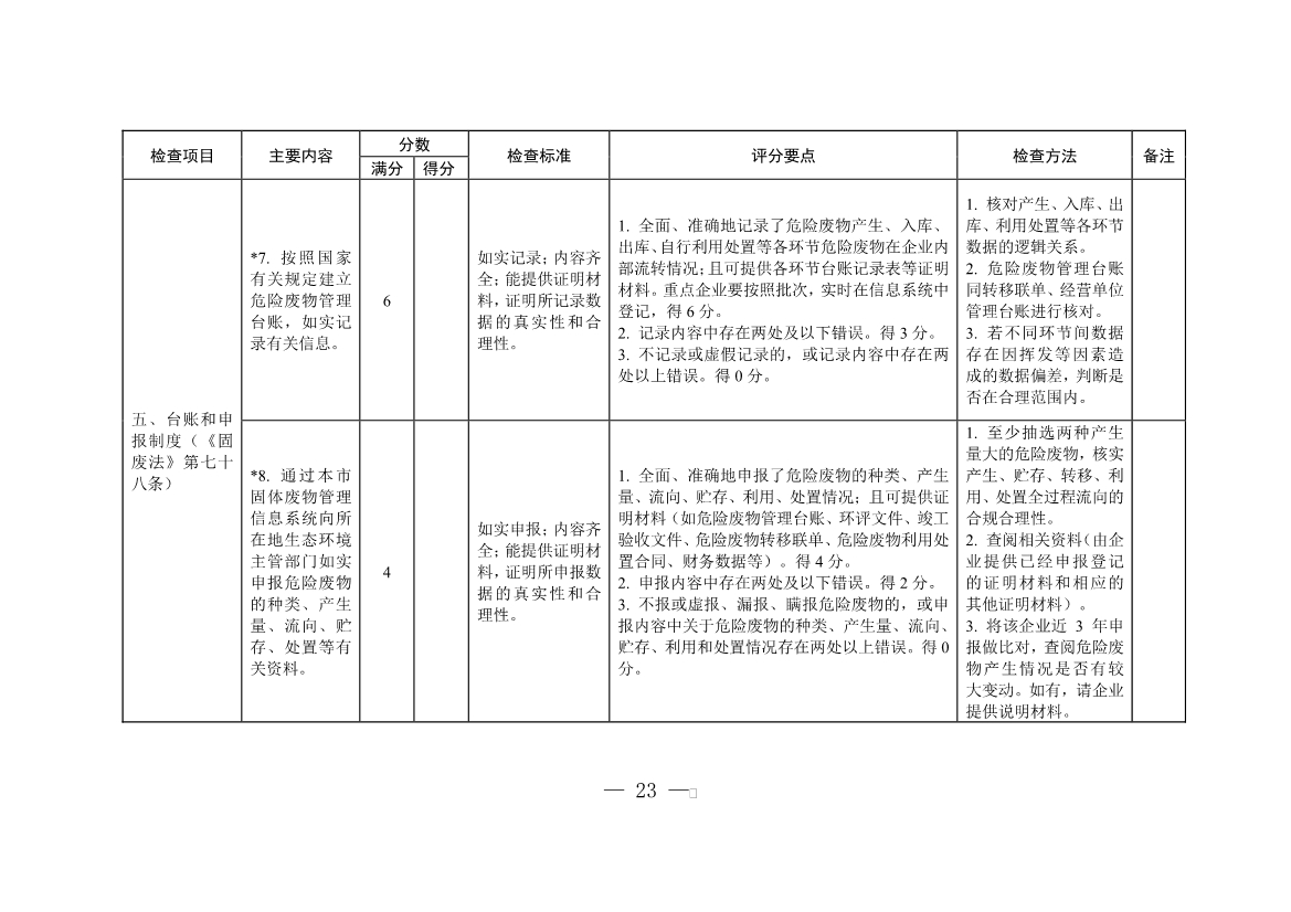 (二)市級(jí)評(píng)估。市生態(tài)環(huán)境局每年按照《危險(xiǎn)廢物規(guī)范化環(huán)境管理評(píng)估指標(biāo)》(附件1,以下簡稱《評(píng)估指標(biāo)》)評(píng)估各區(qū)危險(xiǎn)廢物規(guī)范化環(huán)境環(huán)境管理情況,并對(duì)本市危險(xiǎn)廢物規(guī)范化環(huán)境環(huán)境管理情況進(jìn)行自評(píng)。市環(huán)境執(zhí)法總隊(duì)按照《檢查要點(diǎn)》(附件2)附表2-1對(duì)市管危險(xiǎn)廢物產(chǎn)廢單位進(jìn)行檢查,并填寫《單位檢查情況記錄表》(附件3)。市固化管理中心按照《檢查要點(diǎn)》(附件2)附表2-2對(duì)危險(xiǎn)廢物經(jīng)營單位進(jìn)行檢查,并填寫《單位檢查情況記錄表》(附件3)。