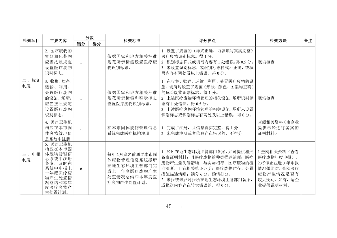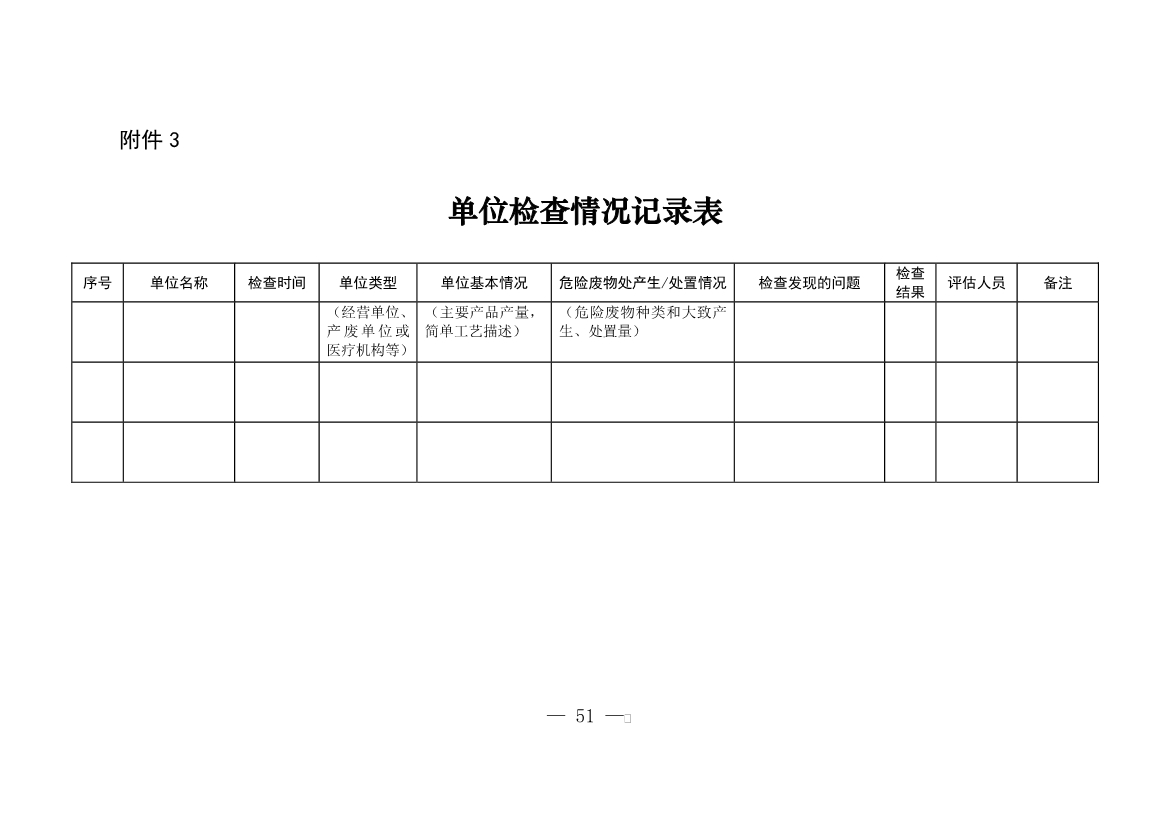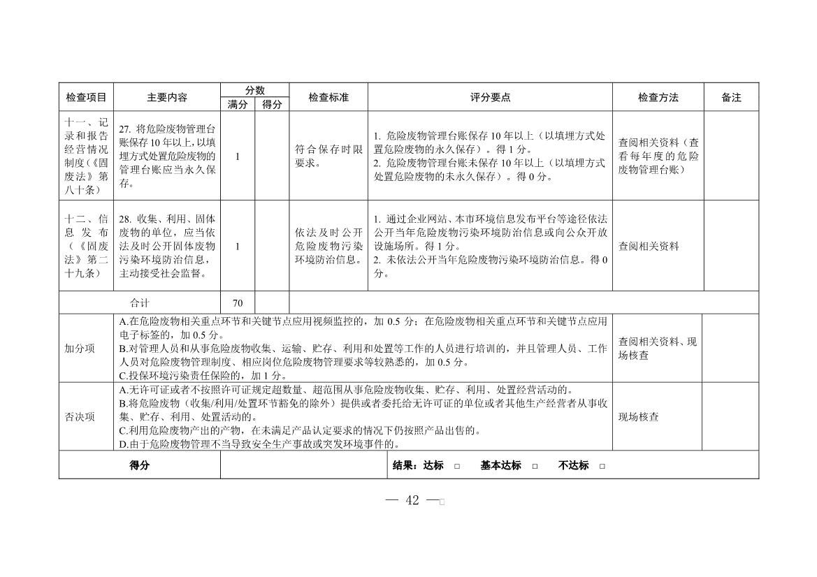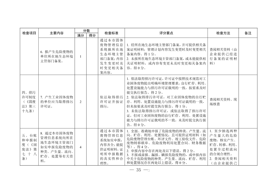 (二)市級(jí)評(píng)估。市生態(tài)環(huán)境局每年按照《危險(xiǎn)廢物規(guī)范化環(huán)境管理評(píng)估指標(biāo)》(附件1,以下簡稱《評(píng)估指標(biāo)》)評(píng)估各區(qū)危險(xiǎn)廢物規(guī)范化環(huán)境環(huán)境管理情況,并對(duì)本市危險(xiǎn)廢物規(guī)范化環(huán)境環(huán)境管理情況進(jìn)行自評(píng)。市環(huán)境執(zhí)法總隊(duì)按照《檢查要點(diǎn)》(附件2)附表2-1對(duì)市管危險(xiǎn)廢物產(chǎn)廢單位進(jìn)行檢查,并填寫《單位檢查情況記錄表》(附件3)。市固化管理中心按照《檢查要點(diǎn)》(附件2)附表2-2對(duì)危險(xiǎn)廢物經(jīng)營單位進(jìn)行檢查,并填寫《單位檢查情況記錄表》(附件3)。
