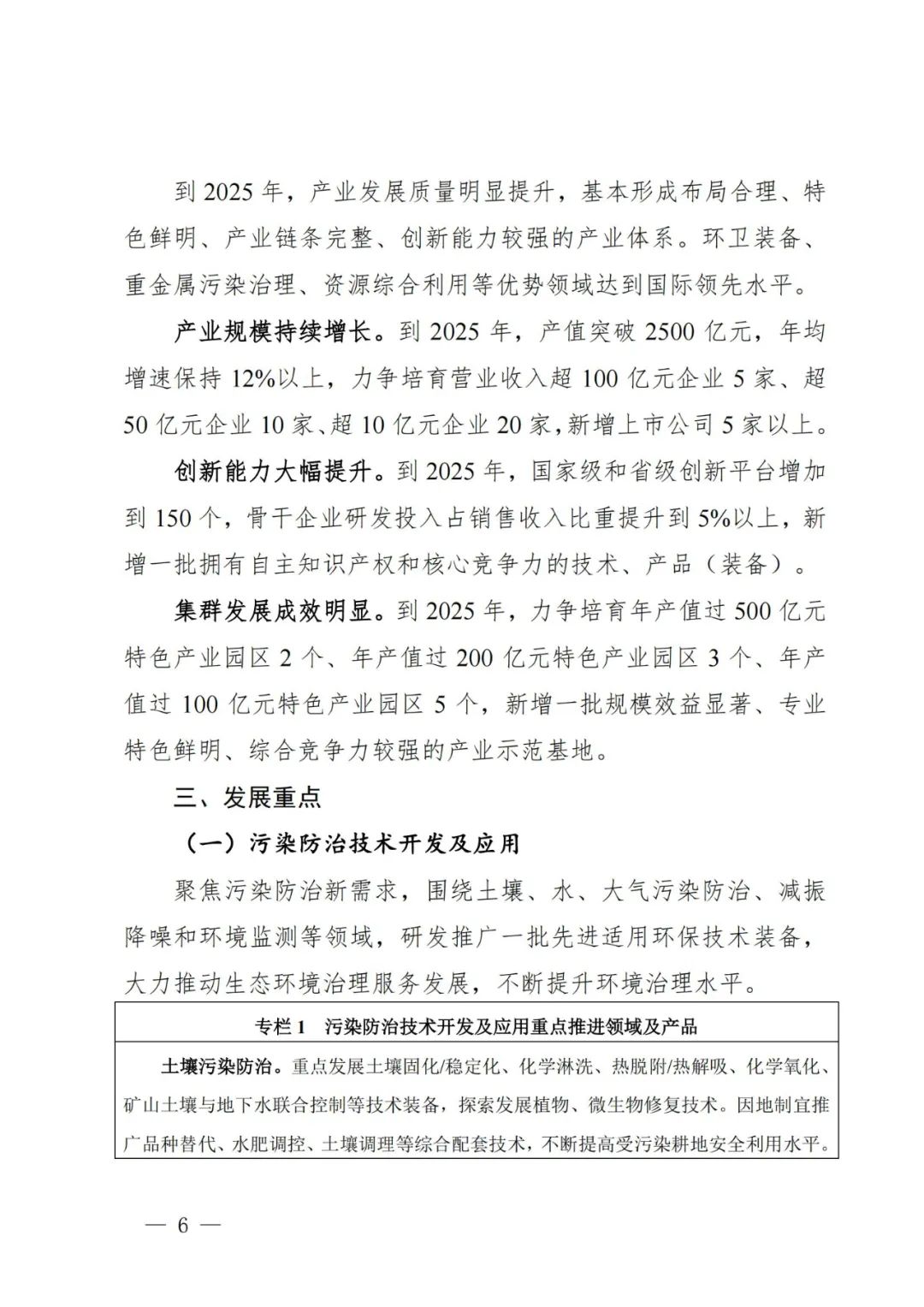 《規(guī)劃》立足湖南省經(jīng)濟(jì)高質(zhì)量發(fā)展的需求,把握環(huán)境治理技術(shù)及應(yīng)用產(chǎn)業(yè)發(fā)展趨勢(shì),按照“節(jié)約優(yōu)先、低碳發(fā)展,科技引領(lǐng)、創(chuàng)新發(fā)展,龍頭帶動(dòng)、集聚發(fā)展,合作共享、開(kāi)放發(fā)展”的基本原則,提出了未來(lái)5年發(fā)展目標(biāo)和重點(diǎn)。到2025年,產(chǎn)業(yè)發(fā)展質(zhì)量明顯提升,基本形成布局合理、特色鮮明、產(chǎn)業(yè)鏈條完整、創(chuàng)新能力較強(qiáng)的產(chǎn)業(yè)體系。環(huán)衛(wèi)裝備、重金屬污染治理、資源綜合利用等優(yōu)勢(shì)領(lǐng)域達(dá)到國(guó)際領(lǐng)先水平。并提出了具體目標(biāo):到2025年,產(chǎn)業(yè)規(guī)模持續(xù)增長(zhǎng),產(chǎn)值突破2500億元,年均增速保持12%以上,力爭(zhēng)培育營(yíng)業(yè)收入超100億元企業(yè)5家、超50億元企業(yè)10家、超10億元企業(yè)20家,新增上市公司5家以上;創(chuàng)新能力大幅提升,國(guó)家級(jí)和省級(jí)創(chuàng)新平臺(tái)增加到150個(gè),骨干企業(yè)研發(fā)投入占銷售收入比重提升到5%以上,新增一批擁有自主知識(shí)產(chǎn)權(quán)和核心競(jìng)爭(zhēng)力的技術(shù)、產(chǎn)品(裝備);集群發(fā)展成效明顯,力爭(zhēng)培育年產(chǎn)值過(guò)500億元特色產(chǎn)業(yè)園區(qū)2個(gè)、年產(chǎn)值過(guò)200億元特色產(chǎn)業(yè)園區(qū)3個(gè)、年產(chǎn)值過(guò)100億元特色產(chǎn)業(yè)園區(qū)5個(gè),新增一批規(guī)模效益顯著、專業(yè)特色鮮明、綜合競(jìng)爭(zhēng)力較強(qiáng)的產(chǎn)業(yè)示范基地。