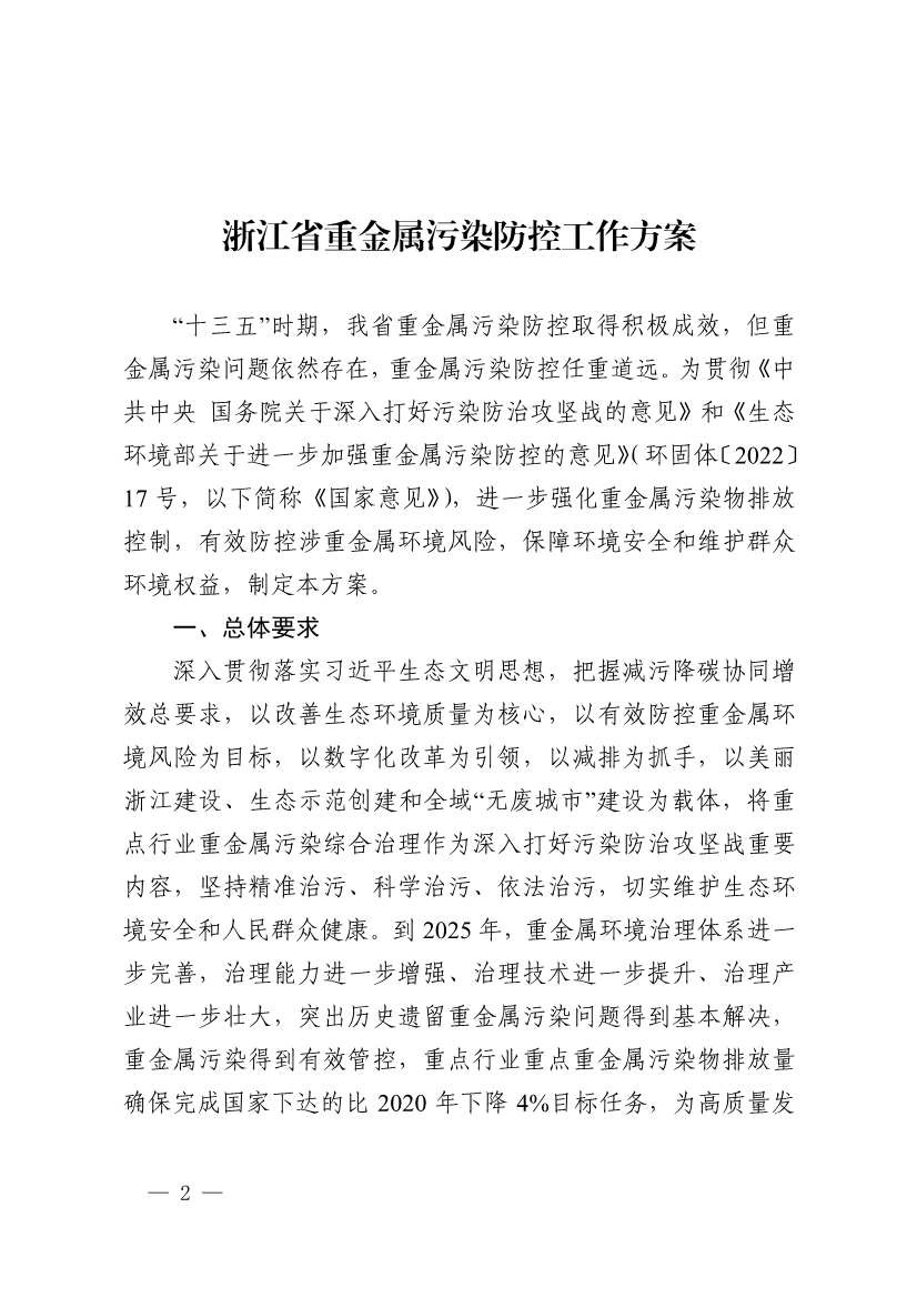 為貫徹《中共中央 國務(wù)院關(guān)于深入打好污染防治攻堅戰(zhàn)的意見》和《生態(tài)環(huán)境部關(guān)于進一步加強重金屬污染防控的意見》(環(huán)固體〔2022〕17 號,以下簡稱《國家意見》),進一步強化重金屬污染物排放控制,有效防控涉重金屬環(huán)境風(fēng)險,保障環(huán)境安全和維護群眾環(huán)境權(quán)益,浙江發(fā)布《浙江省重金屬污染防控工作方案》。詳情如下: