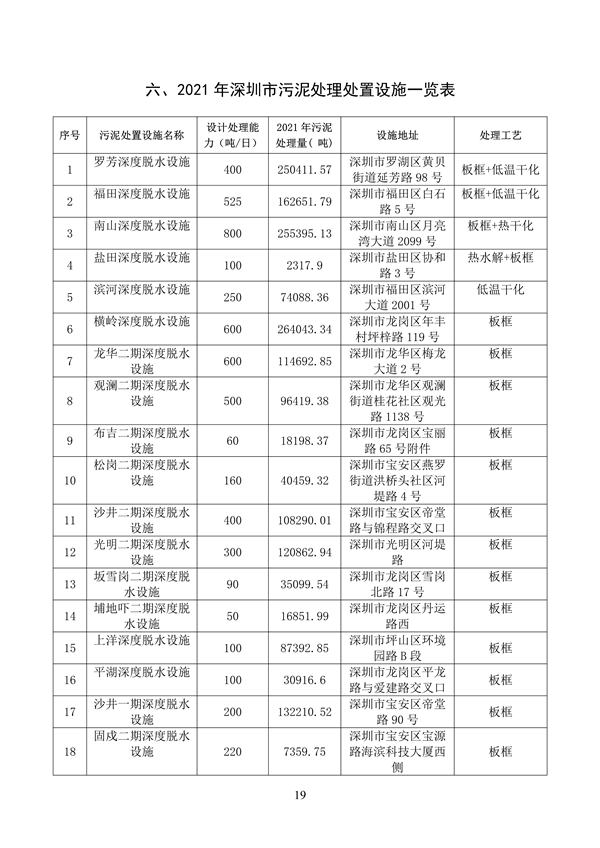 五、市政污泥:2021年,深圳市正在運(yùn)行的水質(zhì)凈化廠39座,污泥深度脫水設(shè)施共19座,處理能力提升至6200噸/日。2021年1-12月總計(jì)產(chǎn)生污泥2107616.07噸(含水率80%計(jì)),深度脫水至809359.48噸(各種含水率),其中市內(nèi)處置659979.9噸,無(wú)害化處置率100%。處置方式主要采用摻燒、土地利用和建材利用三種方式,全市深度脫水效果顯著。
