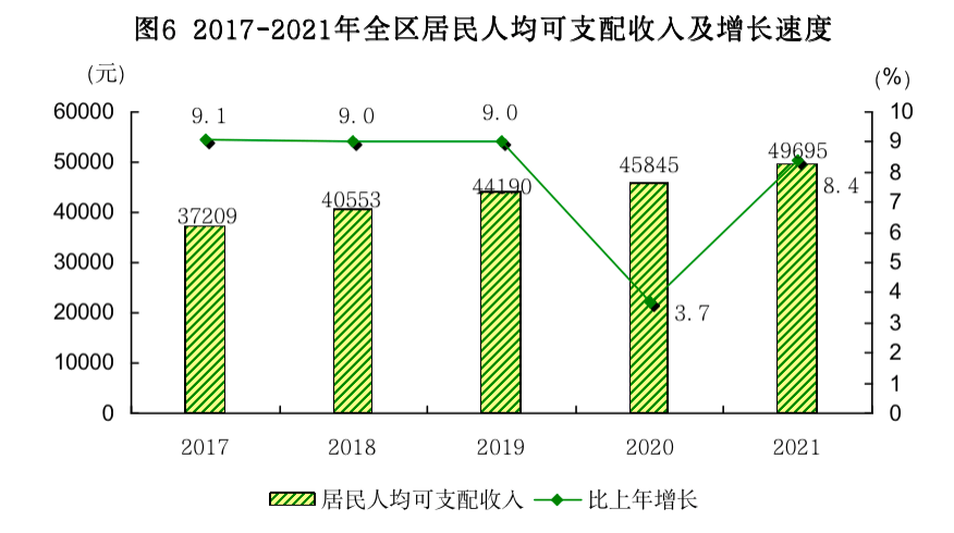 2021年,全區(qū)居民人均可支配收入達(dá)到49695元,比上年增長(zhǎng)8.4%,其中,城鎮(zhèn)居民人均可支配收入59674元,增長(zhǎng)8.3%。從四項(xiàng)收入構(gòu)成看,居民人均工資性收入35152元,人均經(jīng)營(yíng)凈收入798元,人均財(cái)產(chǎn)凈收入6335元,人均轉(zhuǎn)移凈收入7409元。