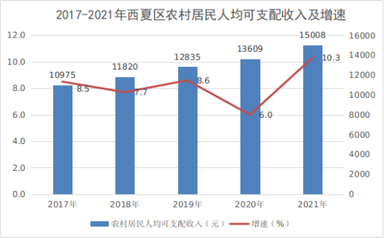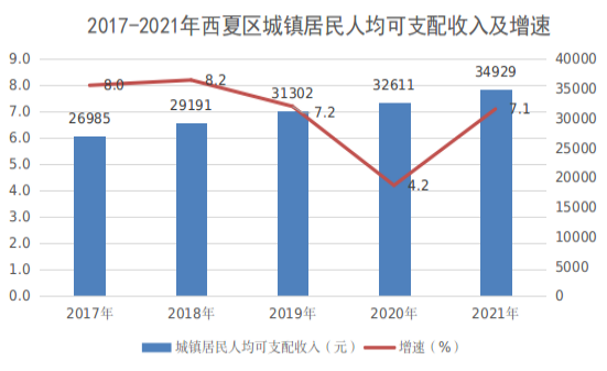 2021年,西夏區(qū)城鎮(zhèn)居民人均可支配收入34929元,比上年增加2318元,增長7.1%;農(nóng)村居民人均可支配收入15008元,比上年增加1399元,增長10.3%。