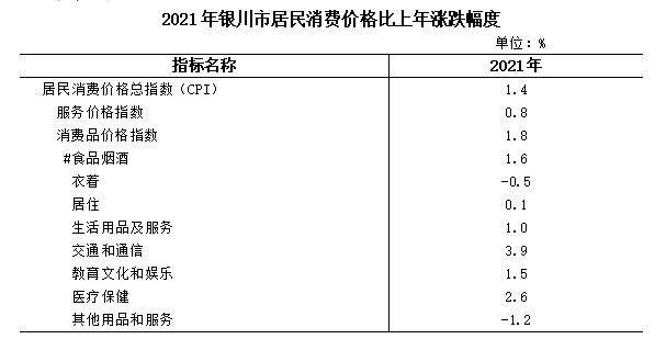 2021年,銀川市居民消費價格比上年上漲1.4%。其中,交通和通信類上漲3.9%、醫(yī)療保健類上漲2.6%、食品煙酒類上漲1.6%、教育文化和娛樂類上漲1.5%、生活用品及服務類上漲1.0%、居住類上漲0.1%、其他用品和服務下降1.2%、衣著類下降0.5%。