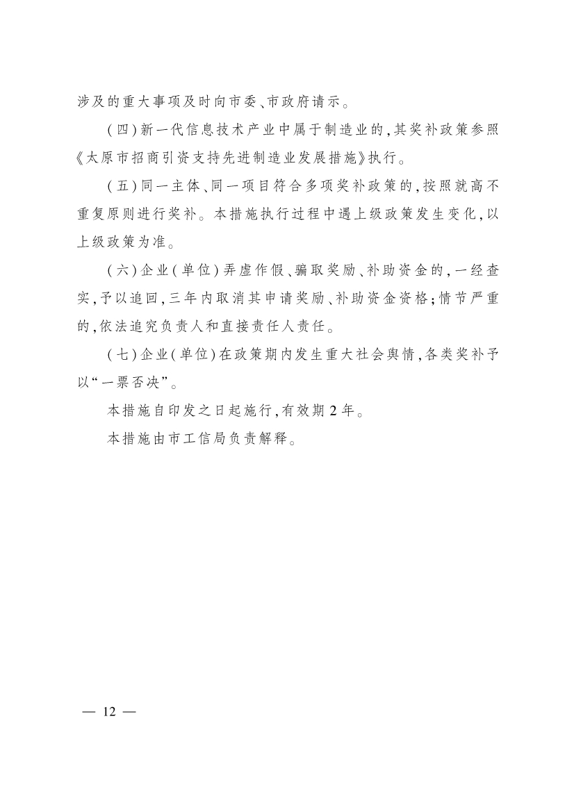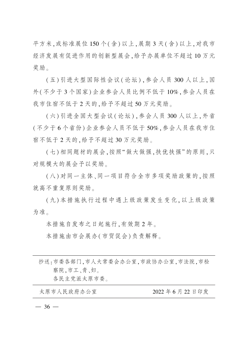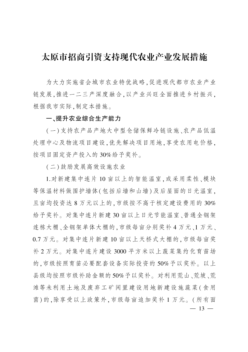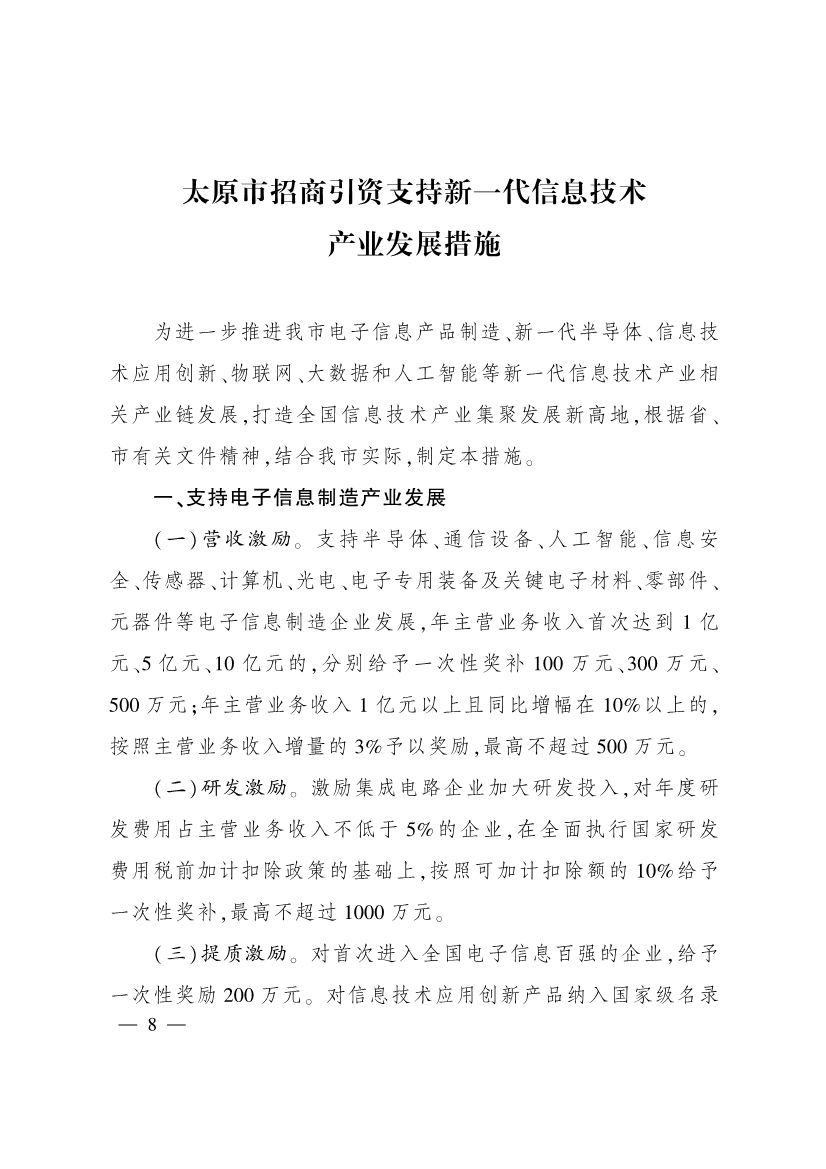 為進(jìn)一步加大招商引資力度,促進(jìn)產(chǎn)業(yè)結(jié)構(gòu)優(yōu)化升級,推動全市經(jīng)濟(jì)高質(zhì)量發(fā)展,市有關(guān)部門制定了《太原市招商引資支持先進(jìn)制造業(yè)發(fā)展措施》《太原市招商引資支持新一代信息技術(shù)產(chǎn)業(yè)發(fā)展措施》《太原市招商引資支持現(xiàn)代農(nóng)業(yè)產(chǎn)業(yè)發(fā)展措施》《太原市招商引資支持商貿(mào)流通業(yè)發(fā)展措施》《太原市招商引資支持文旅產(chǎn)業(yè)發(fā)展措施》《太原市招商引資支持新能源產(chǎn)業(yè)發(fā)展措施》《太原市招商引資支持標(biāo)準(zhǔn)化廠房建設(shè)運(yùn)營措施》《太原市招商引資支持會展業(yè)發(fā)展措施》等措施,經(jīng)市人民政府同意,現(xiàn)印發(fā)給你們,請按照執(zhí)行。
