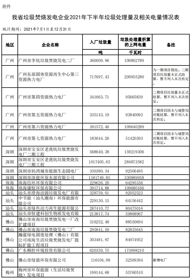廣東省發(fā)展改革委關(guān)于公布有關(guān)垃圾焚燒發(fā)電企業(yè)2021年下半年垃圾處理量及相關(guān)電量的通知