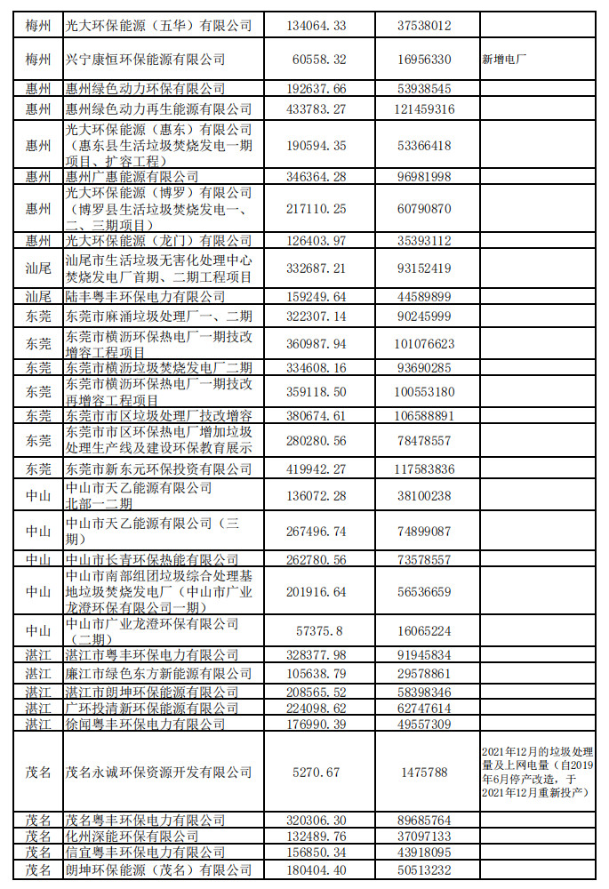 廣東省公布有關(guān)垃圾焚燒發(fā)電企業(yè)2021年下半年垃圾處理量及相關(guān)電量